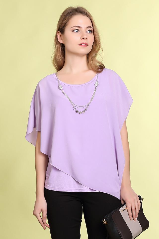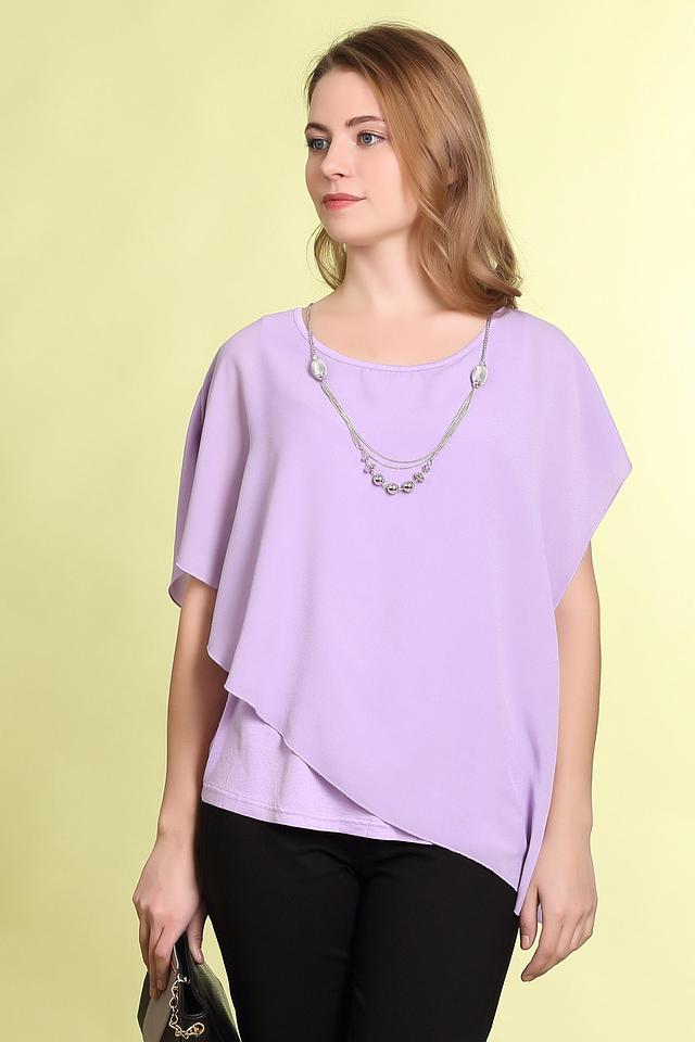 Лиловая блуза Pezzo свободного кроя с асимметричным подолом и деликатной драпировкой. Модель дополнена изящной многослойной цепочкой, придающей образу элегантность и завершенность. Состав: полиэстер 100%, вискоза 95%, эластан 5%