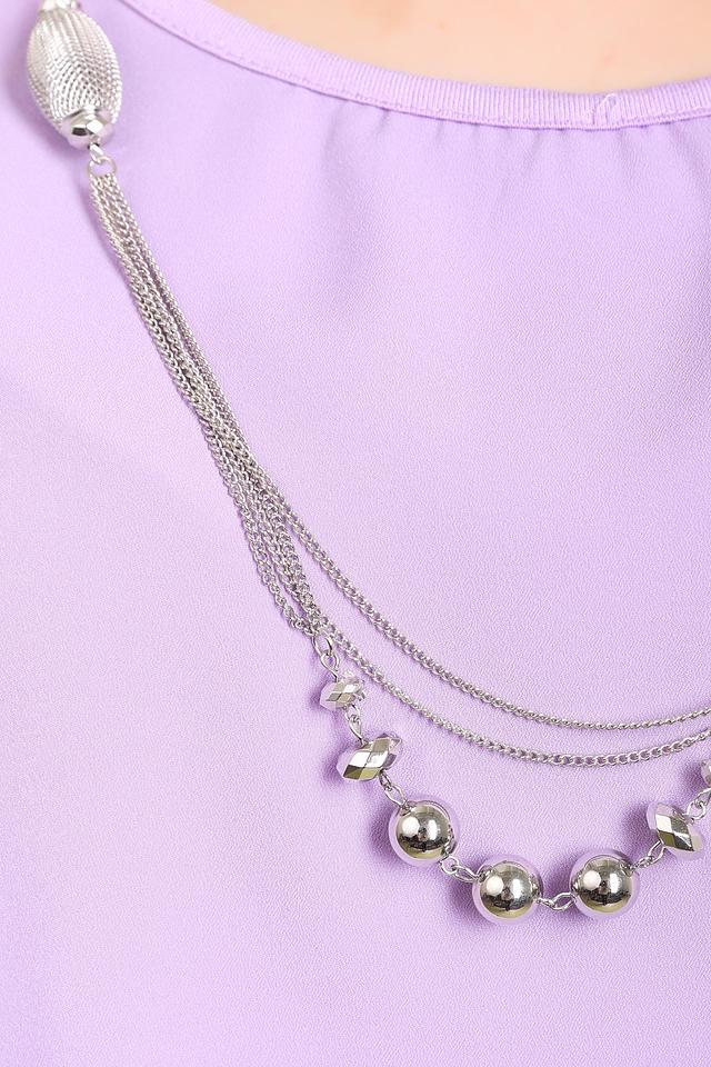 Особый акцент в этой модели – многослойная цепочка, украшающая вырез горловины. Она придает образу элегантность и завершенность. Блуза изготовлена из полиэстера, вискозы и эластана, что обеспечивает приятные тактильные ощущения и легкий уход.