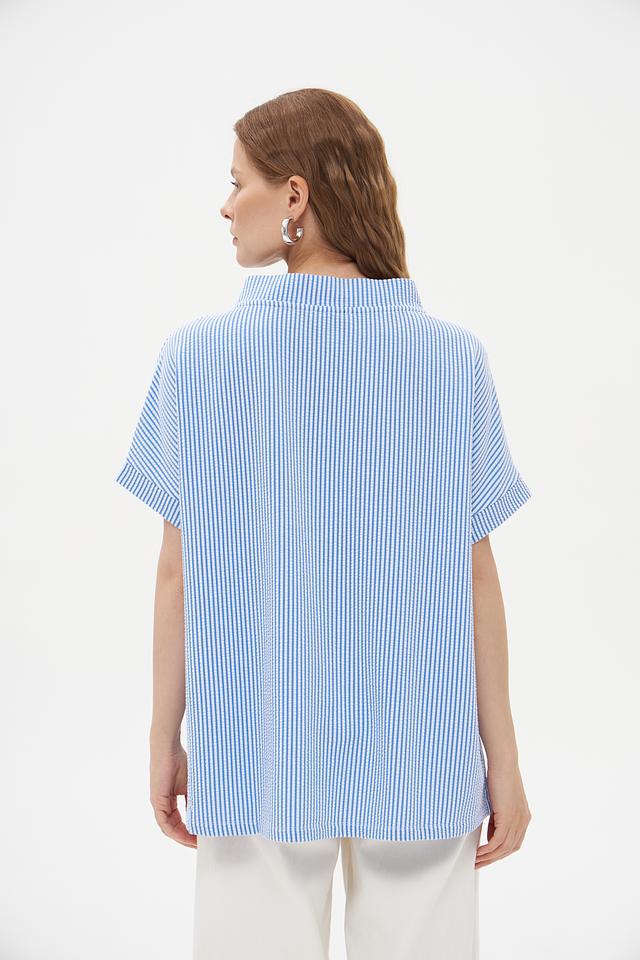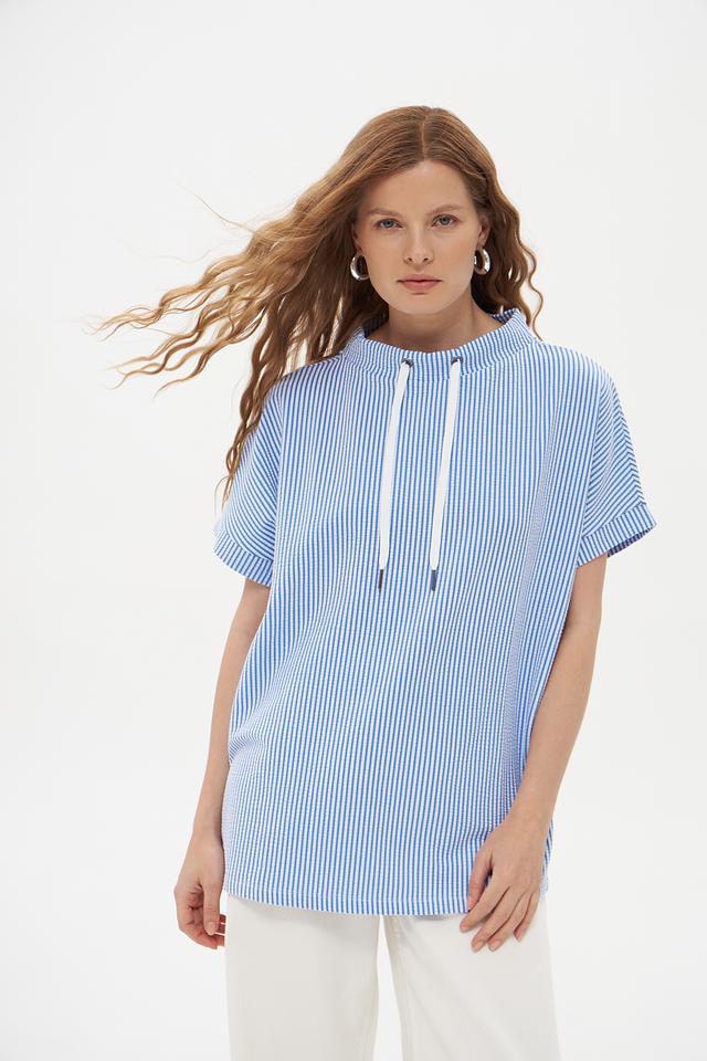 Голубая блуза Pezzo в полоску с короткими рукавами и удобной кулиской на вырезе горловины. Изготовлена из хлопка с добавлением полиэстера и эластана, что обеспечивает комфорт и практичность в носке. Состав: хлопок 68%, полиэстер 29%, эластан 3%