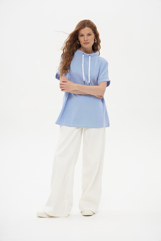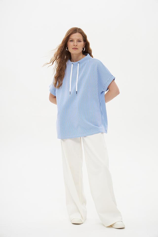 Блуза имеет прямой крой, короткие рукава и округлый вырез горловины, дополненный кулиской с белыми шнурками. Это придает ей более расслабленный и непринужденный вид. Модель выполнена из мягкой и приятной к телу ткани, состоящей из 68% хлопка, 29% полиэстера и 3% эластана.