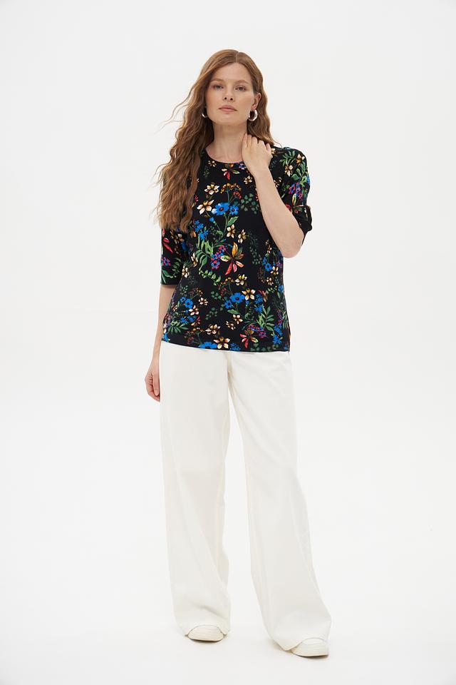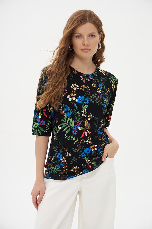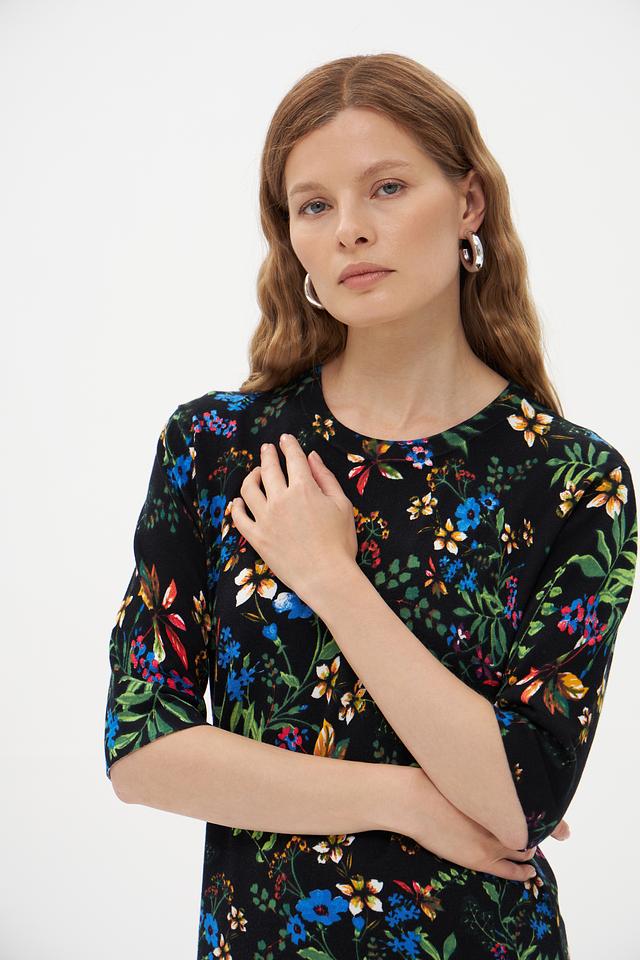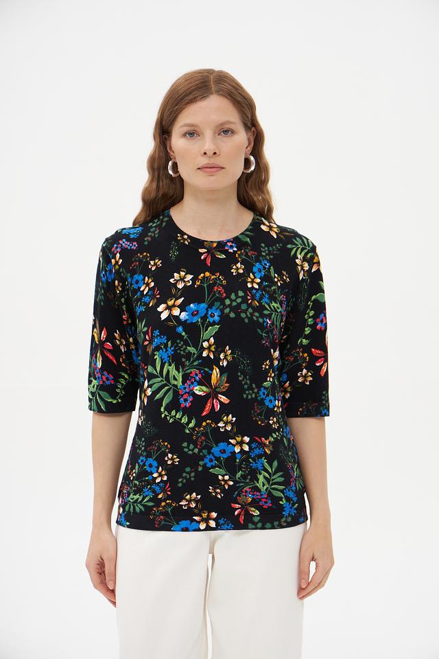 Этот женский пуловер от бренда Pezzo выполнен в чёрном цвете и украшен красочным цветочным принтом. Модель имеет круглый вырез горловины и короткие рукава, что делает её идеальным выбором для тёплой погоды.