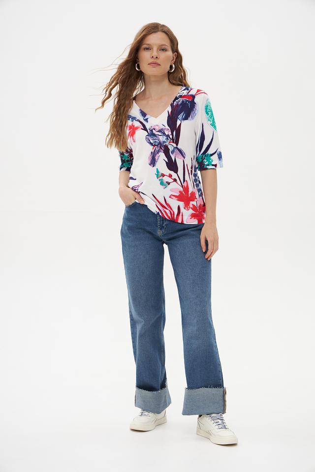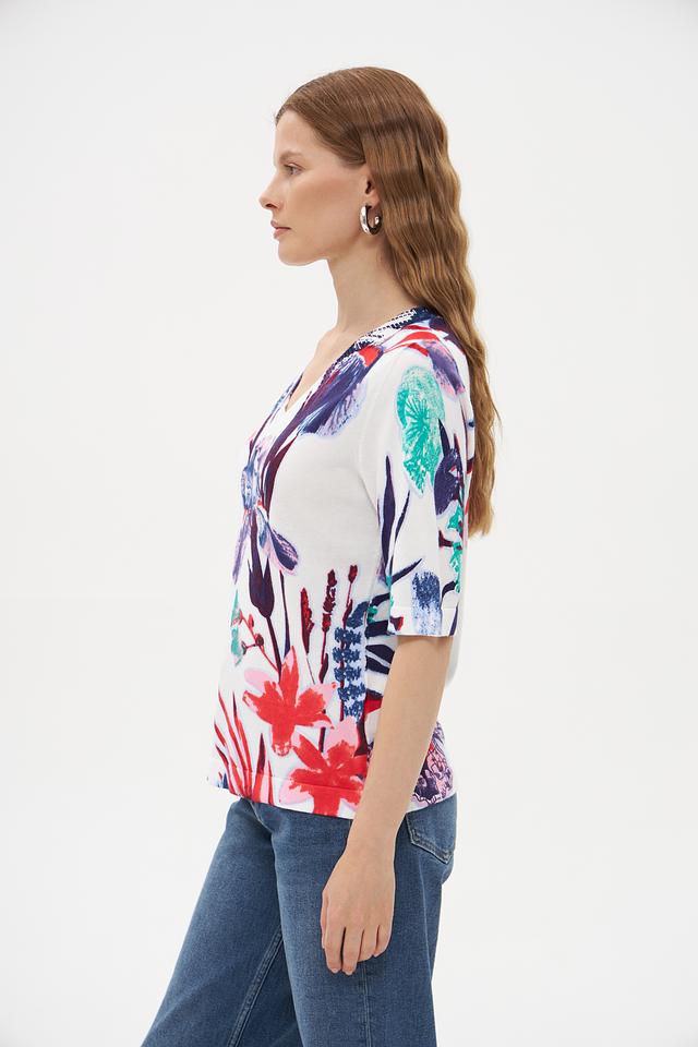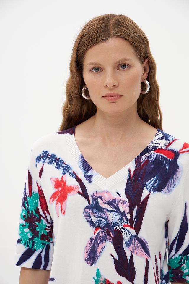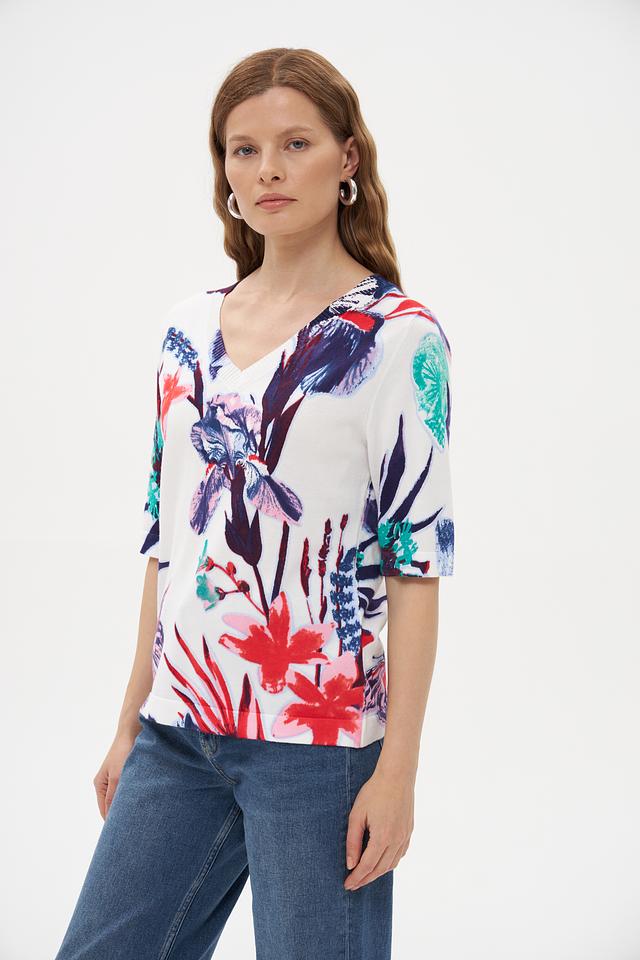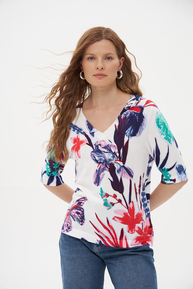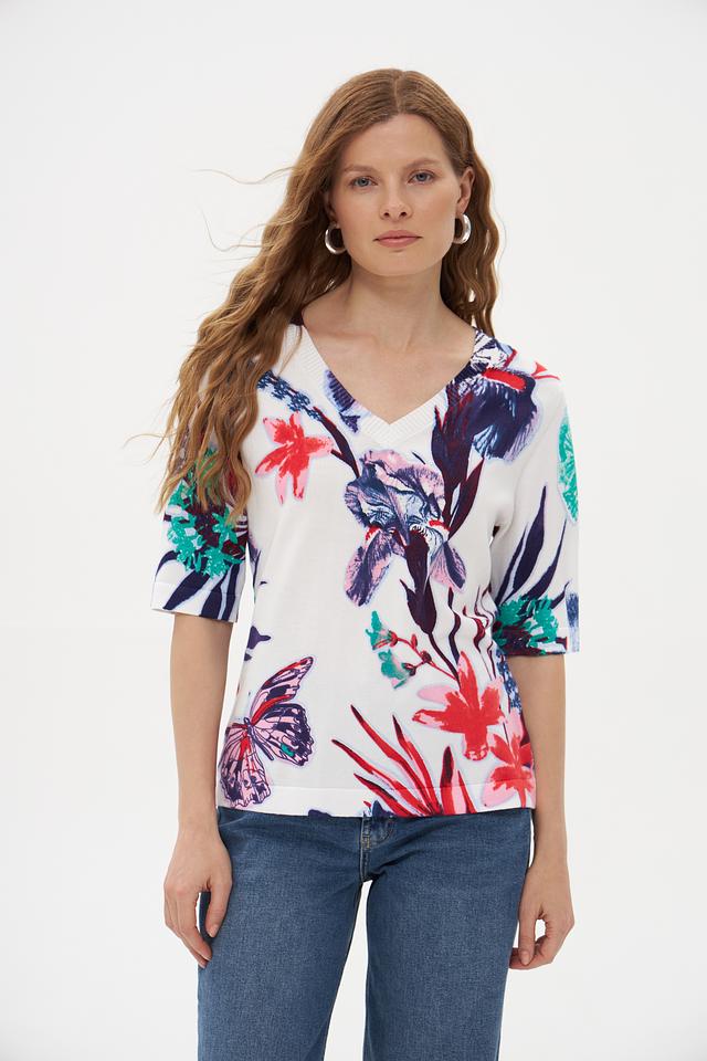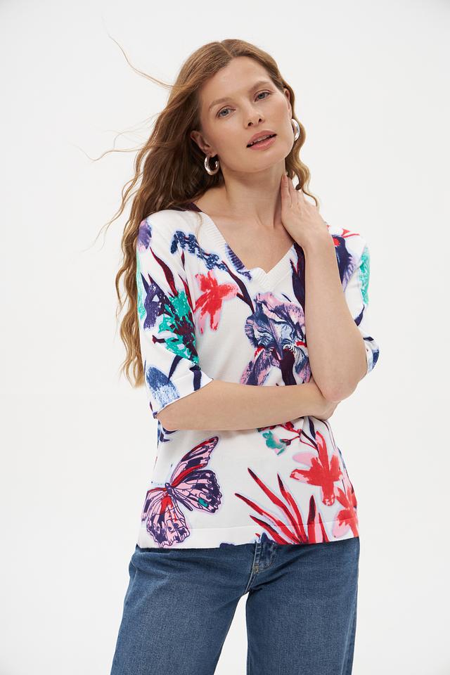 Модель имеет прямой крой, короткие рукава и V-образный вырез горловины. Главная особенность пуловера – яркий и красочный цветочный принт, включающий в себя изображения цветов и бабочек.