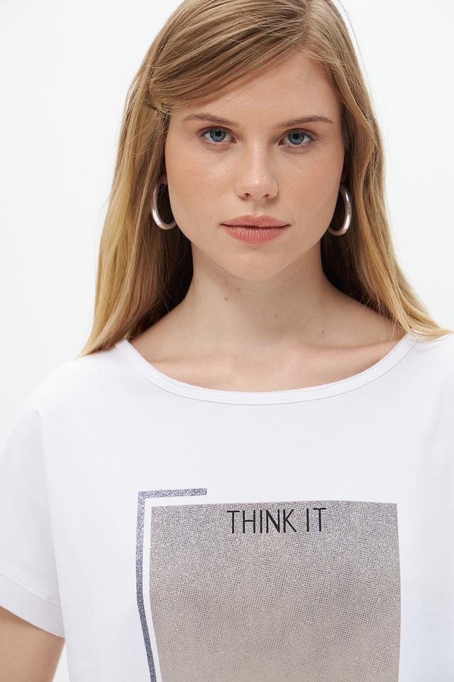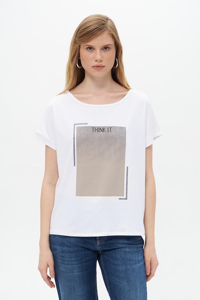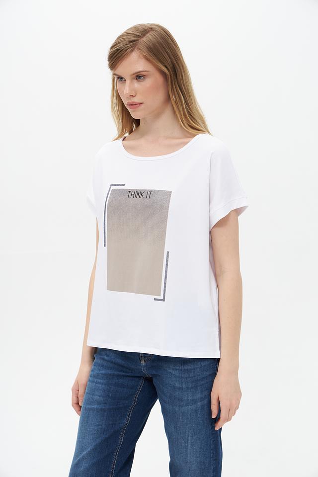 Основной цвет футболки – белый, что делает ее универсальной и легко сочетаемой с другими элементами одежды. На передней части изделия расположен оригинальный графичный принт в бежево-серых тонах, который добавляет образу индивидуальности.