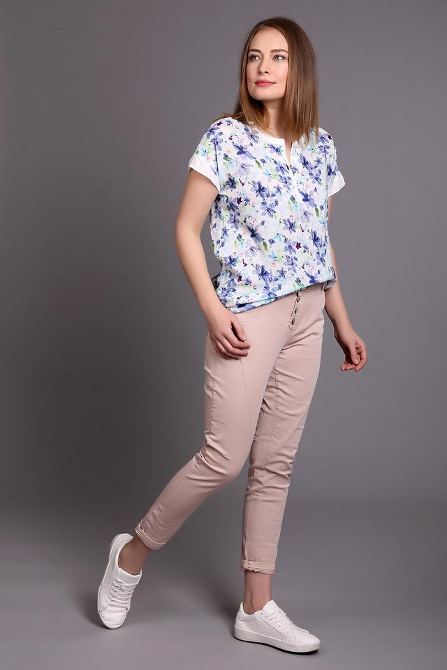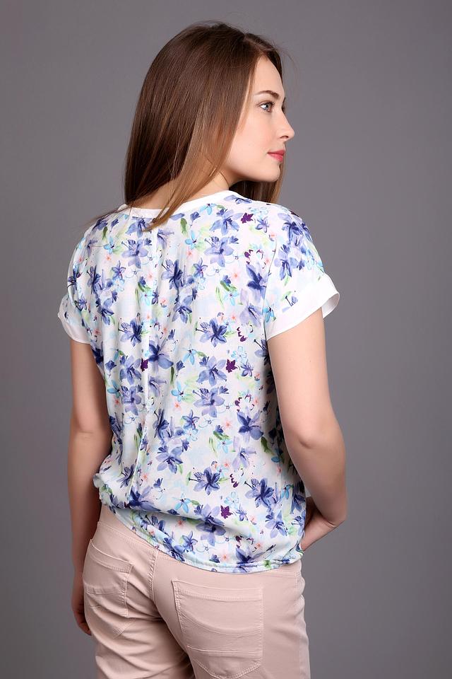Блуза имеет свободный крой, короткие рукава и V-образный вырез, который визуально удлиняет шею. Основной цвет блузы – белый, а ярким акцентом служит цветочный принт, выполненный в голубых, синих и фиолетовых тонах.