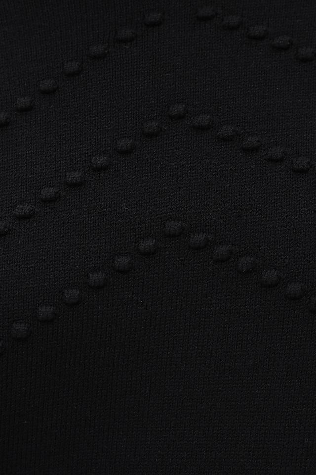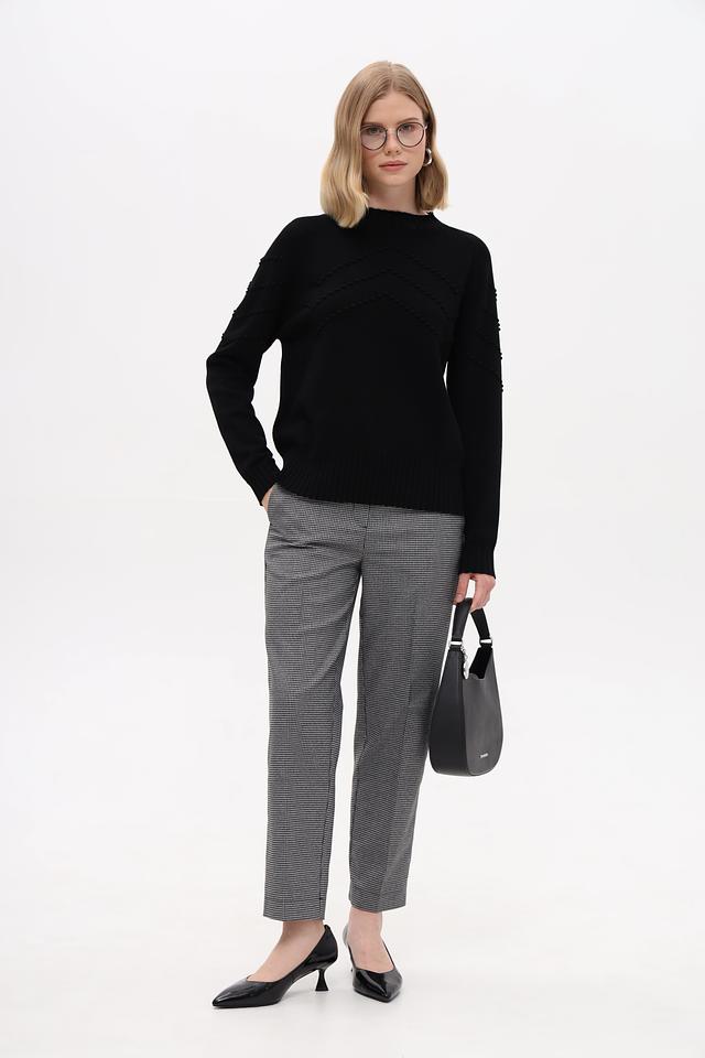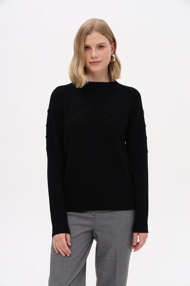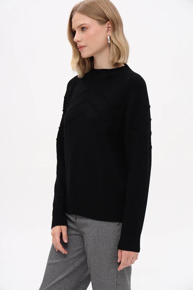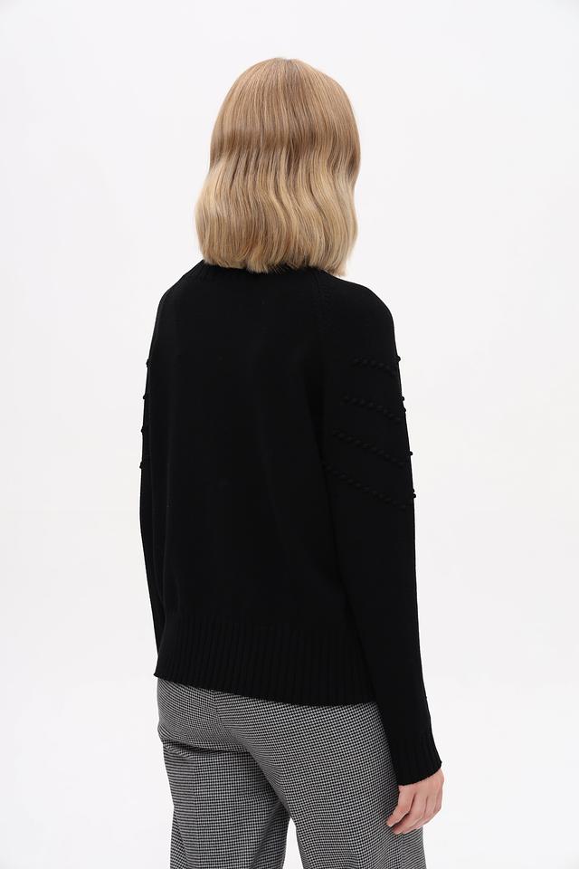 Модель имеет прямой крой, длинные рукава и круглый вырез горловины. Передняя часть пуловера украшена рельефной текстурой в виде небольших бусин, что придает изделию особый шарм и изысканность.