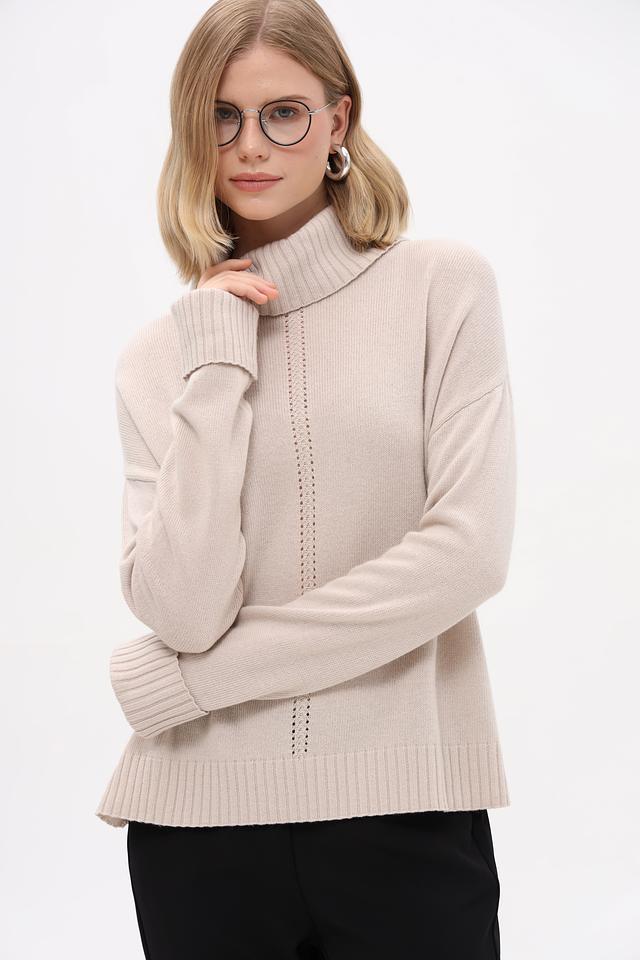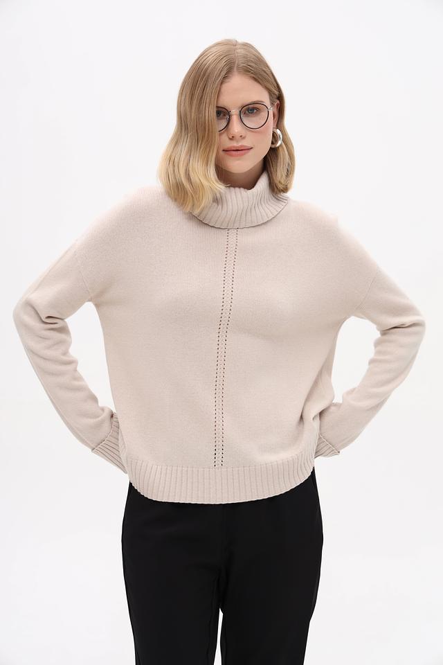 Пуловер имеет высокий ворот, который подчеркивает элегантность силуэта, и оригинальную текстурную вставку по центру переда. Свободный крой не сковывает движения, а длинные рукава делают его подходящим для повседневной носки.