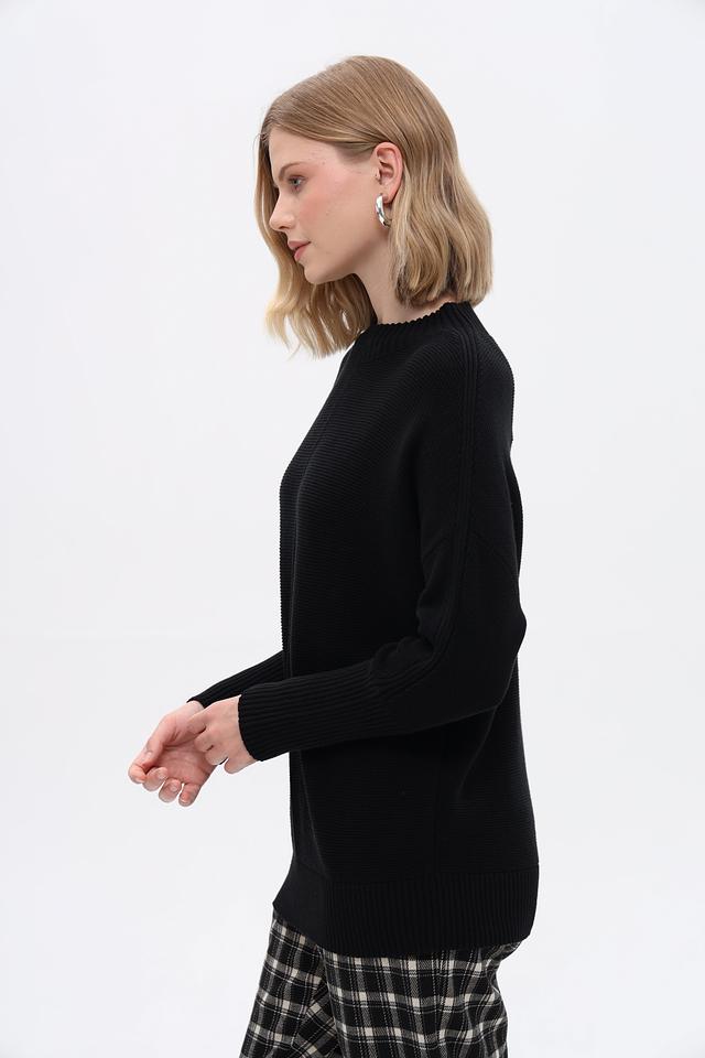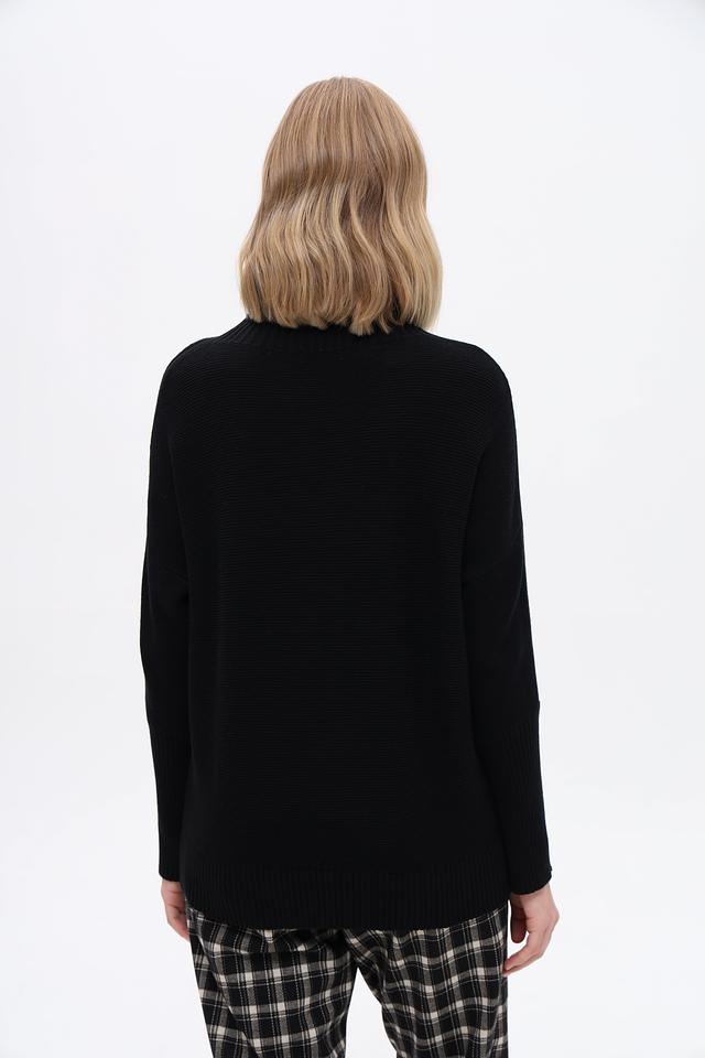 Пуловер имеет свободный крой, прямой силуэт и высокий воротник. Длинные рукава и эластичные манжеты обеспечивают комфортную посадку. Текстура вязания придает изделию объём и фактурность.