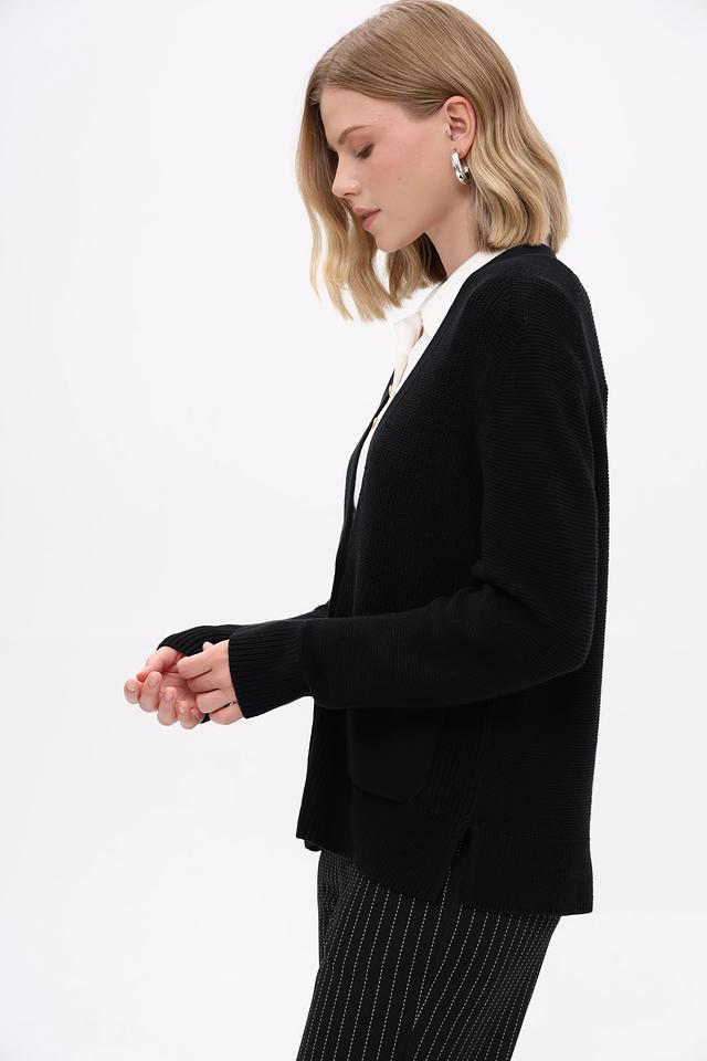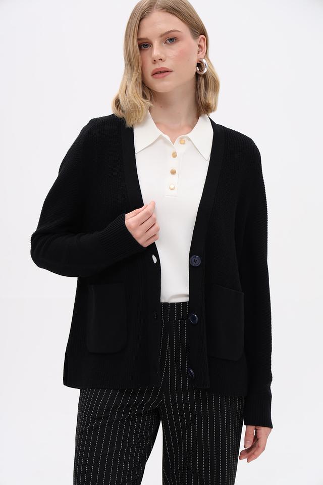 Кардиган имеет V-образный вырез, который визуально удлиняет шею и делает силуэт более изящным. Застёжка на пуговицах позволяет регулировать степень открытости и создавать различные образы. Накладные карманы добавляют функциональности и непринуждённости.