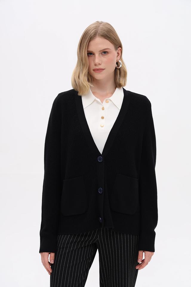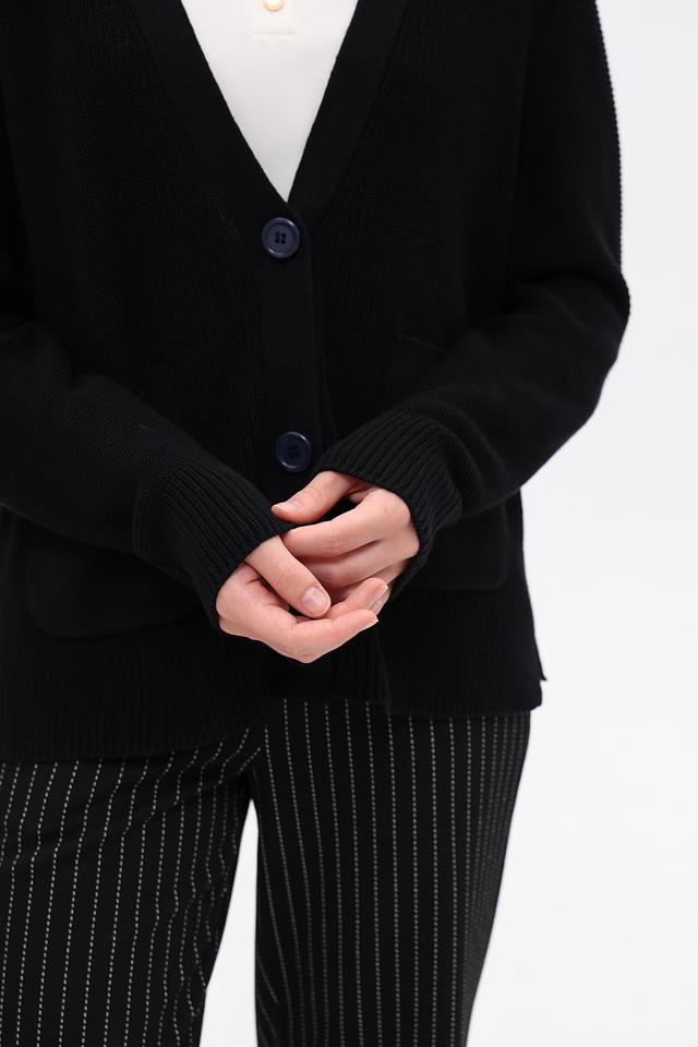 Чёрный кардиган Pezzo из мягкого трикотажа. Модель выполнена из хлопка с добавлением акрила, имеет V-образный вырез и застёжку на пуговицы. Состав: хлопок 60%, акрил 40%