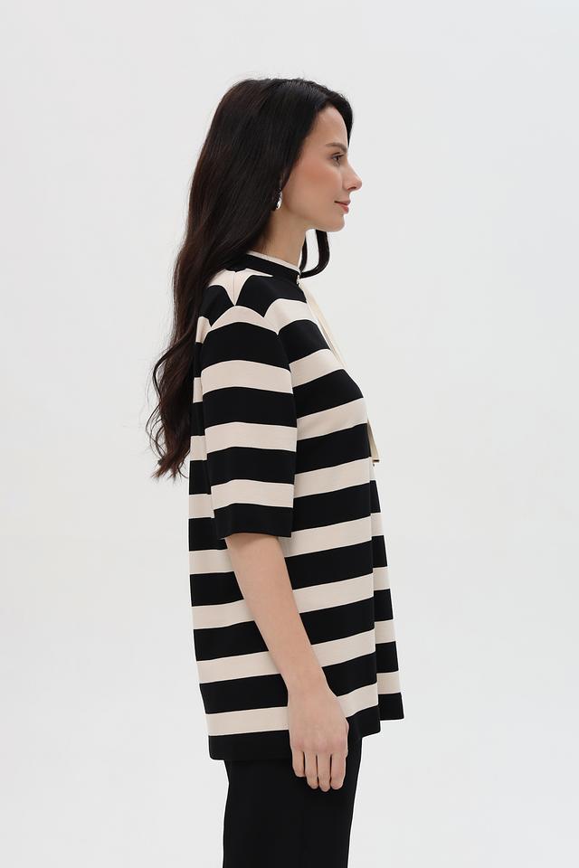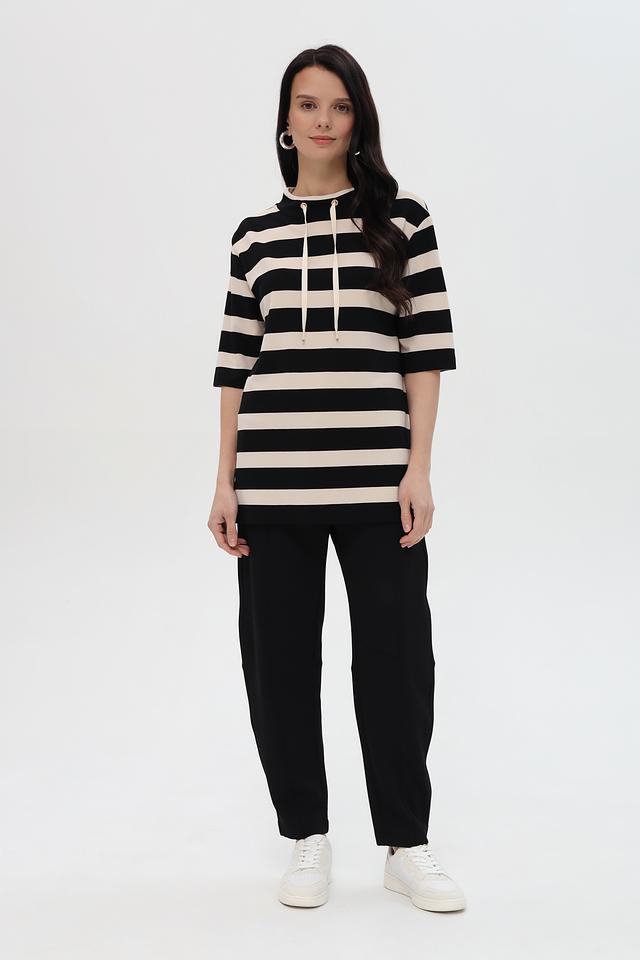 Женская футболка Pezzo чёрно-бежевого цвета с короткими рукавами и капюшоном. Модель выполнена в горизонтальную полоску и имеет свободный крой, что обеспечивает комфорт и стиль в повседневном образе. Состав: вискоза 86%, полиэстер 9%, эластан 5%