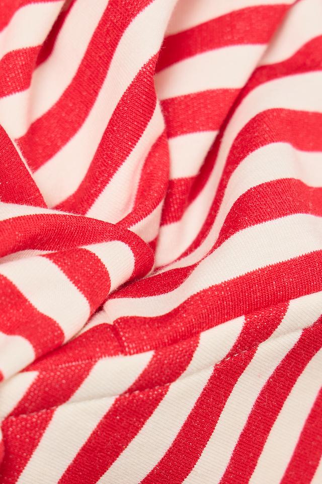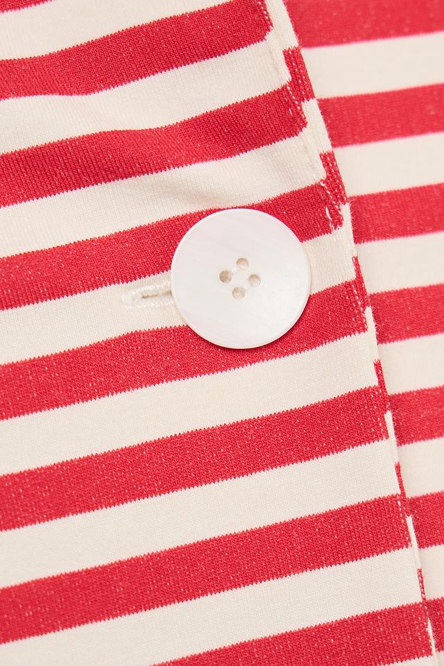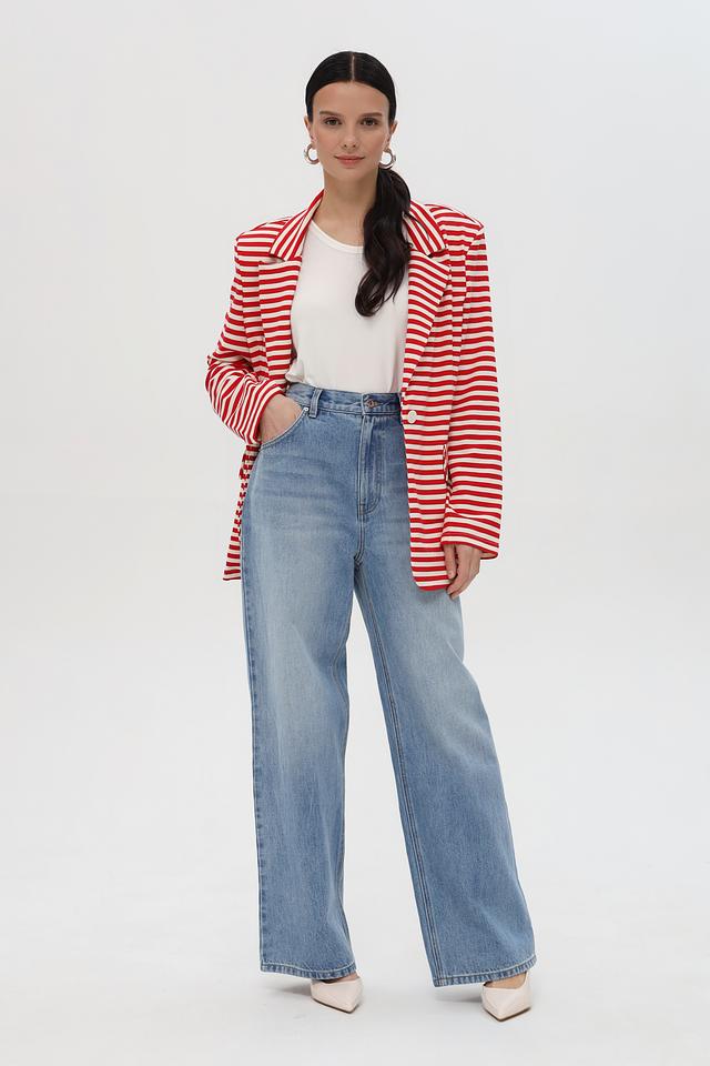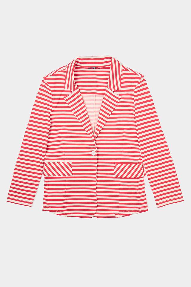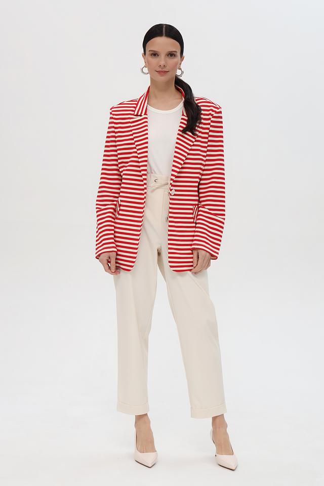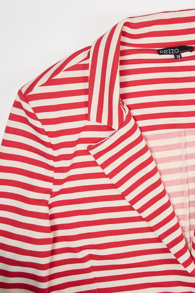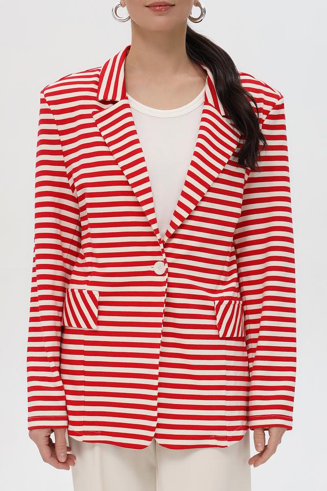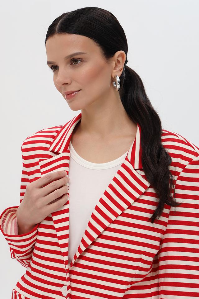 Жакет имеет длинные рукава и стандартную посадку по фигуре. Его отличает яркий дизайн – красная основа с белыми полосками. Такой принт добавит динамики и свежести вашему образу.