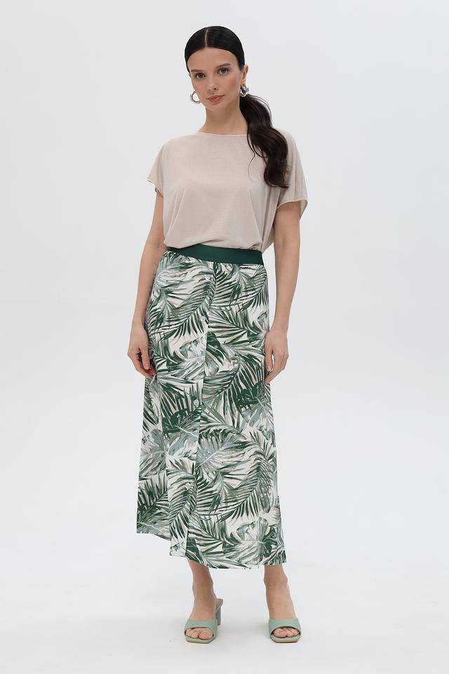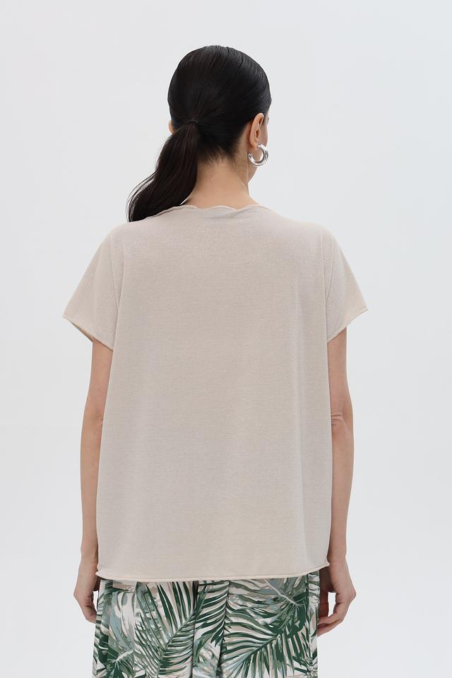 Модель имеет короткие рукава и округлый вырез горловины. Футболка изготовлена из приятной к телу ткани, состоящей из 77% вискозы, 21% полиэстера и 2% эластана. Такое сочетание материалов обеспечивает мягкость, воздухопроницаемость и небольшую эластичность.