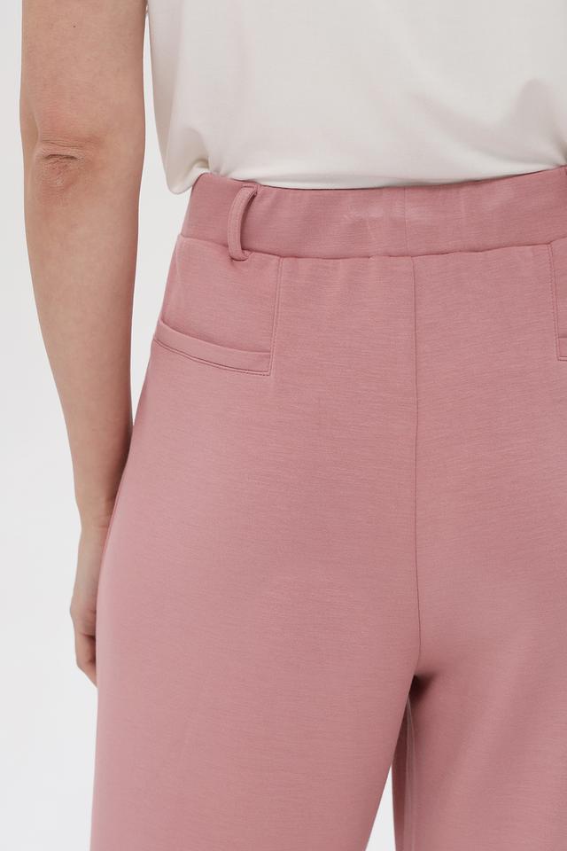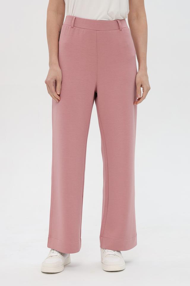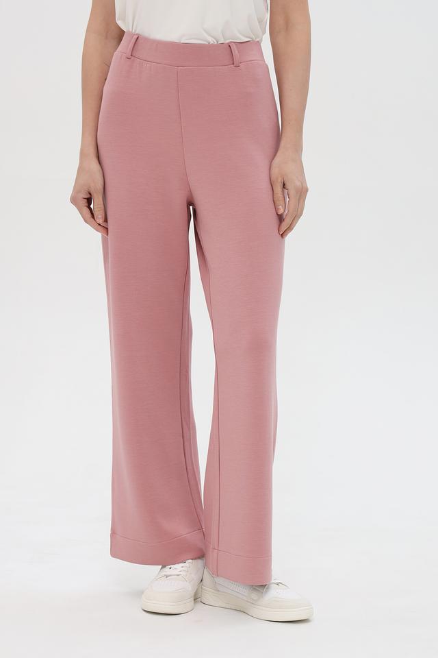 Женские брюки Pezzo нежного пудрового оттенка выполнены из мягкого трикотажа с добавлением модала и эластана. Модель имеет удобный пояс на резинке и боковые карманы. Состав: модал 51%, полиэстер 44%, эластан 5%