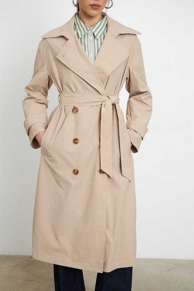Плащ имеет двубортную застёжку на пуговицах, которые выполнены в тон изделия. Пояс позволяет подчеркнуть талию и создать более женственный силуэт. Воротник плаща отложной.