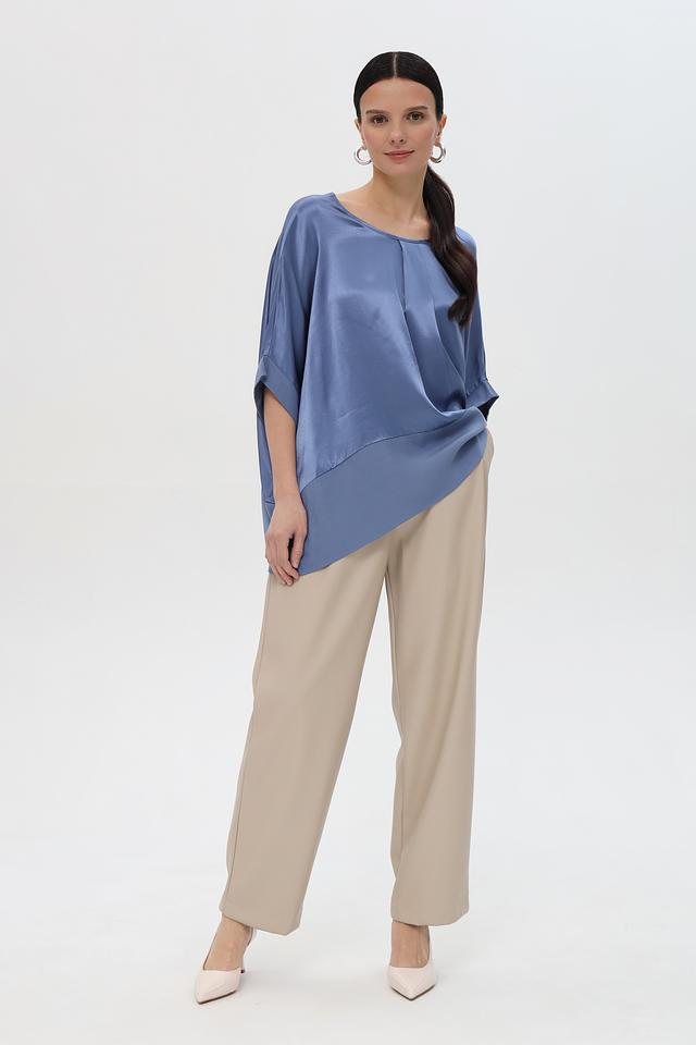 Блуза имеет свободный крой, который обеспечивает комфорт в носке и позволяет создать расслабленный образ. Короткие рукава и округлый вырез горловины добавляют легкости и женственности. Асимметричный низ придает блузе оригинальность и современный вид.