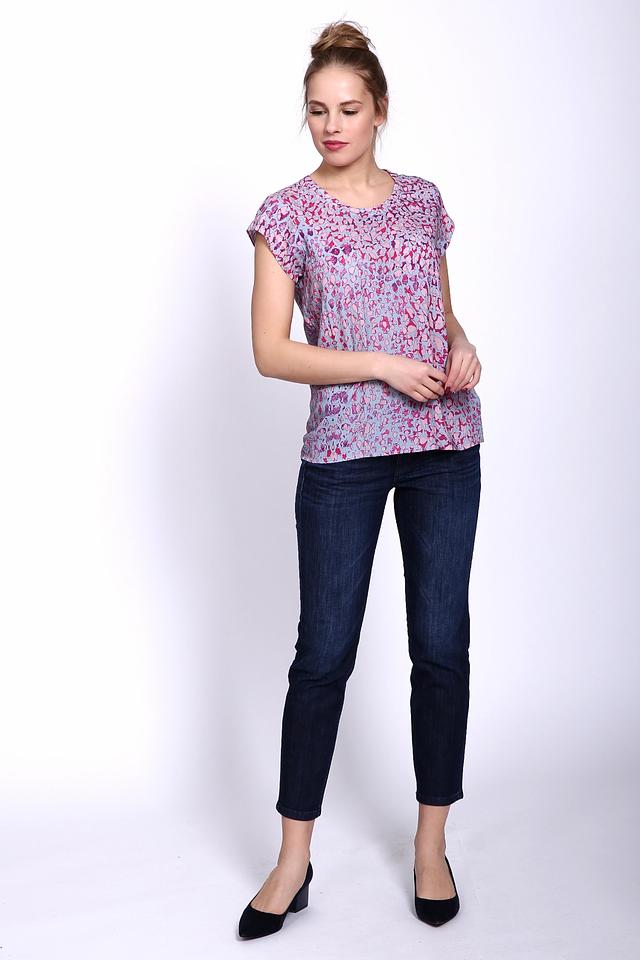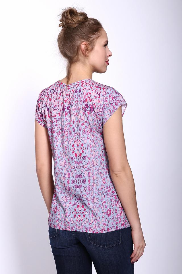 Блуза имеет свободный крой и короткие рукава с небольшими сборками, что придает ей легкость и воздушность. Основной цвет блузы – светло-голубой, а яркий цветочный принт добавляет образу женственности и игривости.