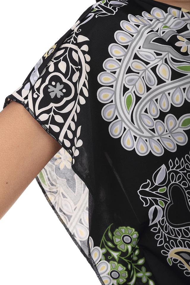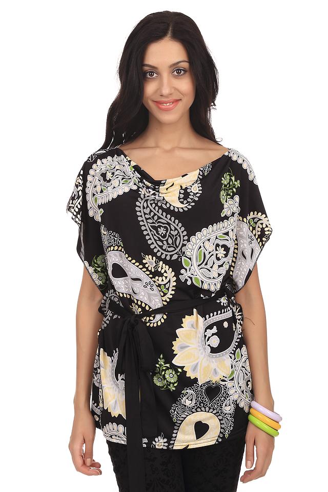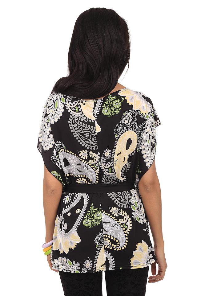 Блуза Pezzo выполнена в цветовой гамме черного и серого оттенков. Украшена узорами "турецкого огурца" и разнообразных цветов. На талии фиксируется элегантным поясом из лент. В состав блузы входит полиэстер с незначительным добавлением эластина. Такой наряд будет гармонично смотреться, как с леггинсами, так и с джинсами. Подойдет для ежедневного использования и встреч с друзьями.