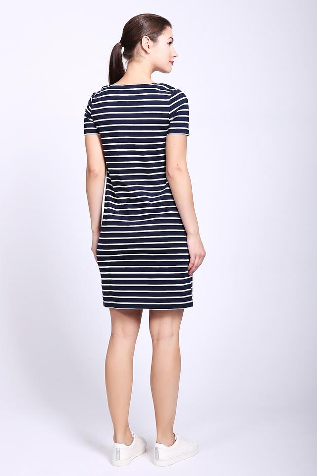 Это платье от бренда Pezzo выполнено в классическом стиле с полосатым принтом. Основной цвет – темно-синий, полосы – белые, создавая контрастный и свежий образ.