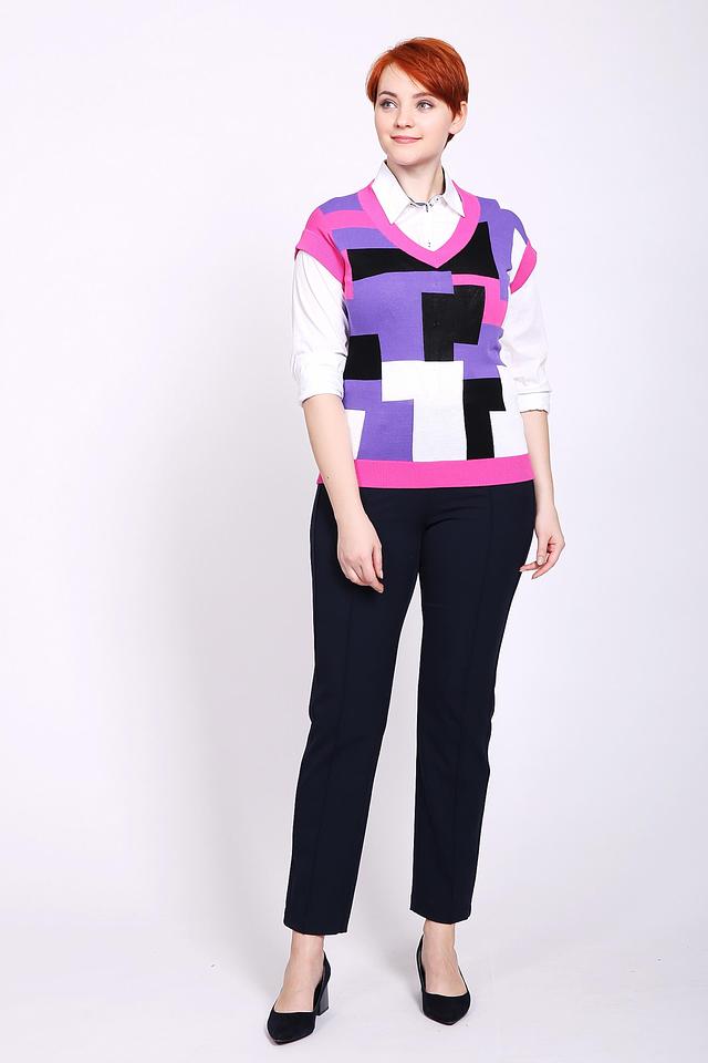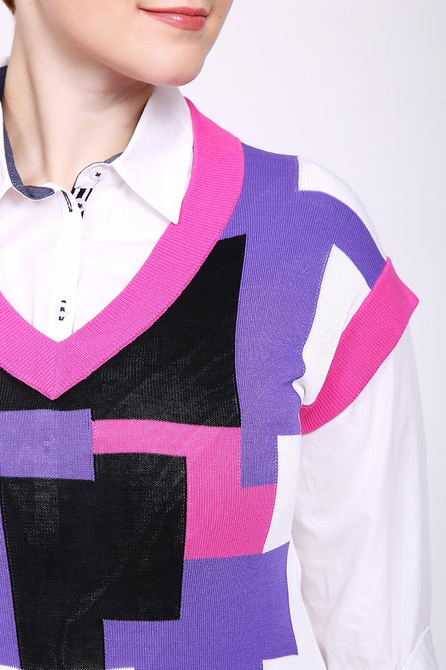 Жилет имеет V-образный вырез и прямой крой, что делает его универсальным и подходящим для разных типов фигур. Яркий геометрический принт добавляет образу динамичности и индивидуальности.