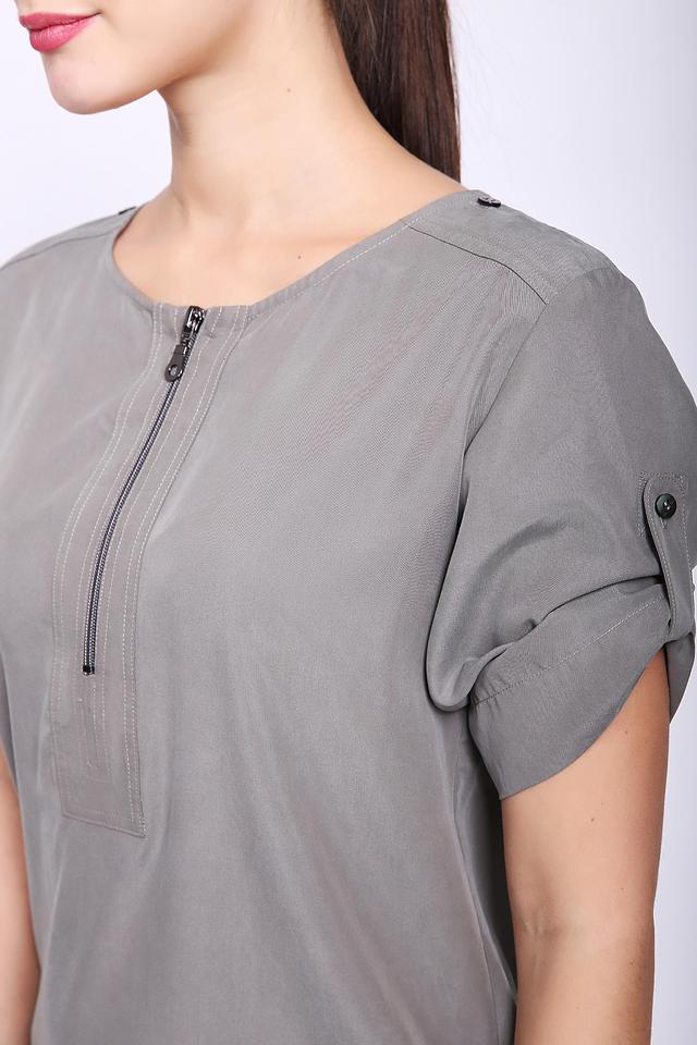 Стильное платье Pezzo серого цвета с короткой молнией на горловине и рукавами 3/4. Изготовлено из мягкой ткани модал с добавлением полиэстера для комфорта и практичности. Состав: модал 80%, полиэстер 20%