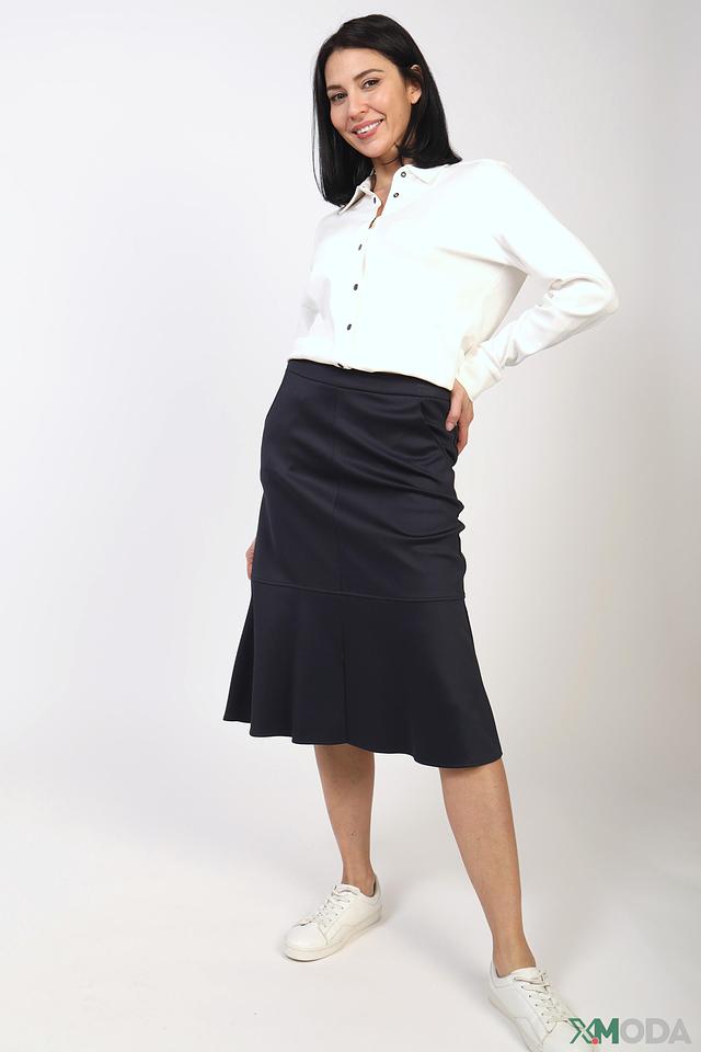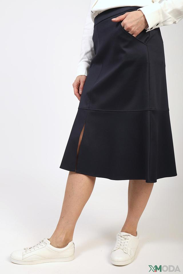 Юбка имеет длину миди и клёш, что придает ей женственность и изящество. Небольшой разрез спереди добавляет образу динамики и лёгкости.