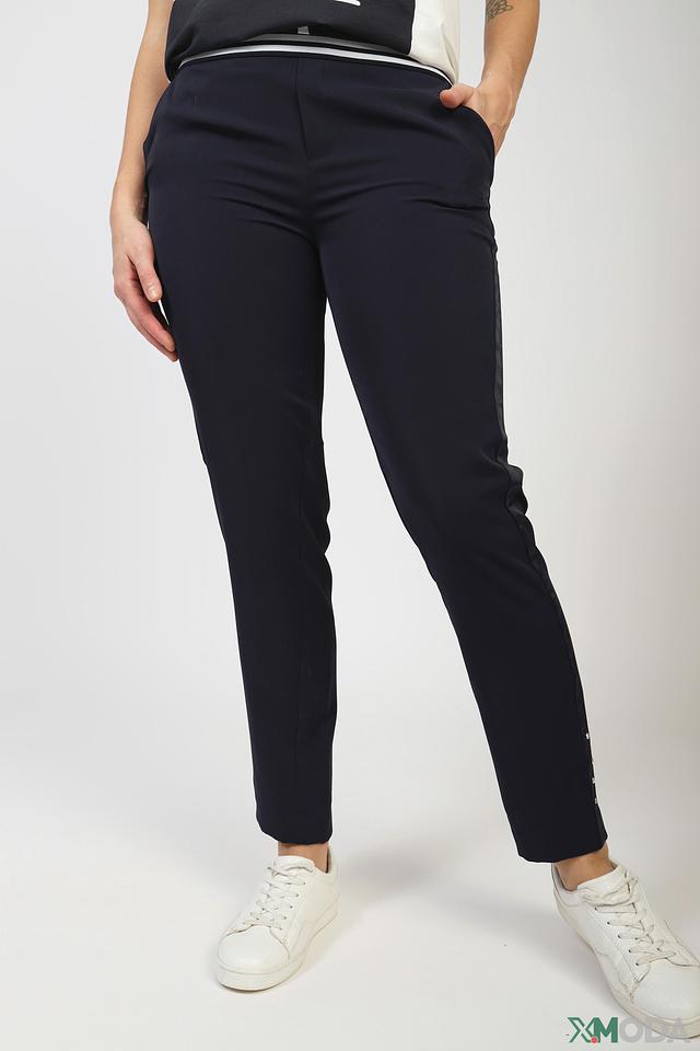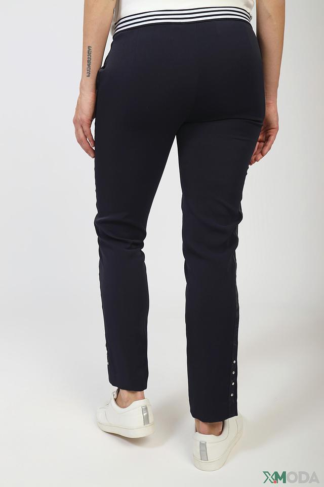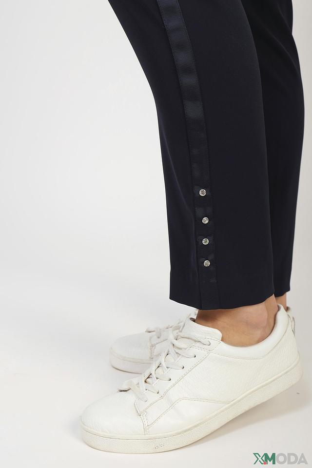 Женские брюки Pezzo темно-синего цвета с контрастной полоской по боковому шву. Модель выполнена из гладкой ткани и дополнена декоративными пуговицами на штанинах. Состав: полиэстер 100%