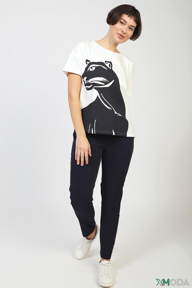 Брюки имеют прямой крой и стандартную посадку по талии. Отличительной особенностью является контрастная полоска, проходящая вдоль бокового шва, добавляющая образу динамичности. Декоративные пуговицы, расположенные на штанинах, придают брюкам изысканный вид.