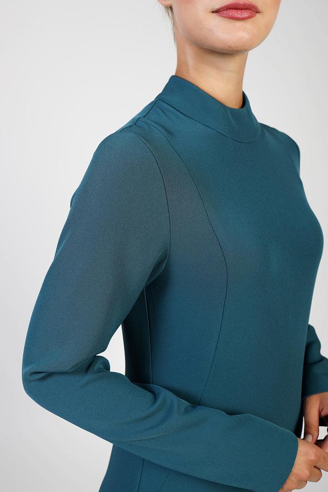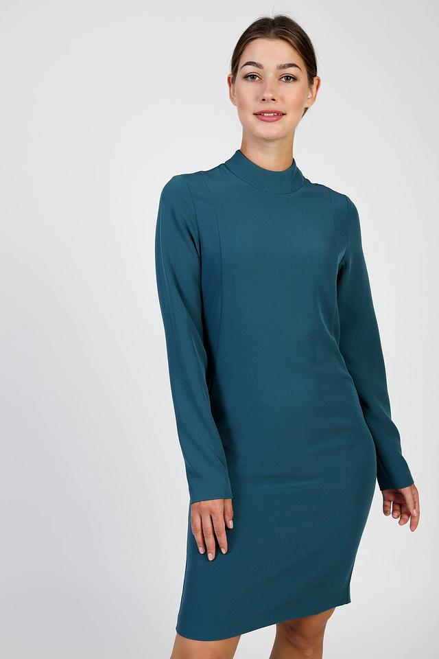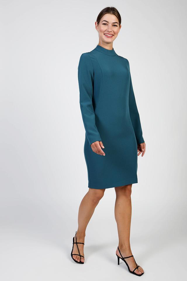 Платье имеет длинные рукава и высокий воротник-стойку, что придает ему сдержанную элегантность. Застежка-молния расположена сзади, обеспечивая удобство при надевании. Ткань платья – это сочетание полиэстера (96%) и спандекса (4%), что гарантирует комфорт в носке и легкий уход.