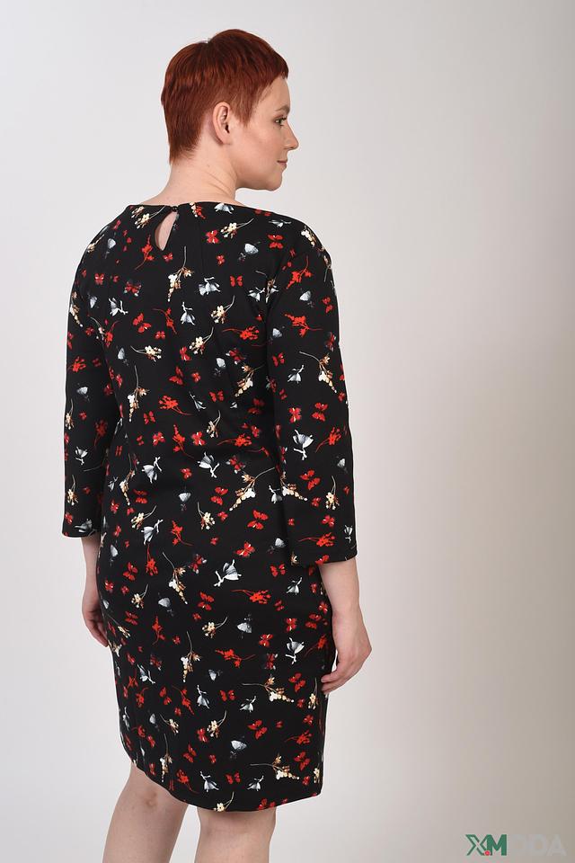 Платье имеет прямой силуэт, длину до колена и удобные рукава 3/4. Вырез горловины округлый, а на спине предусмотрен небольшой вырез, добавляющий образу лёгкости и изящества. Боковые швы платья имеют небольшие карманы.