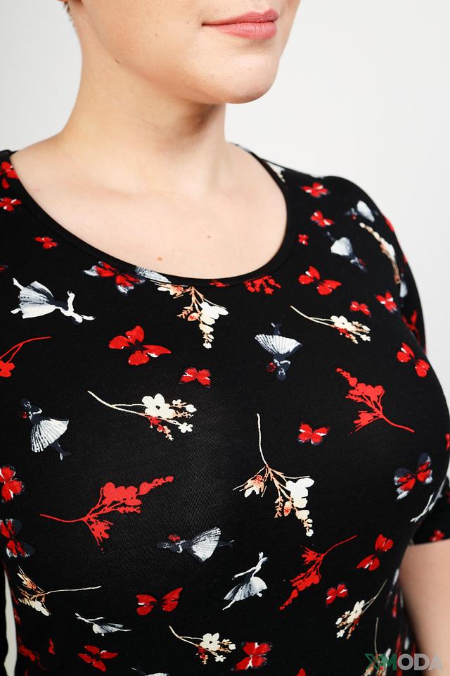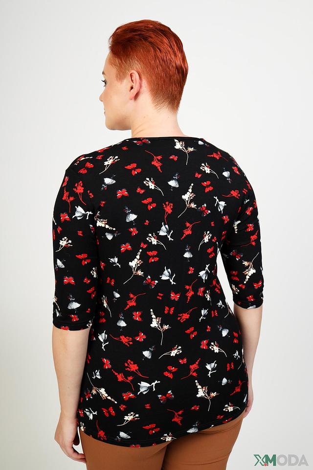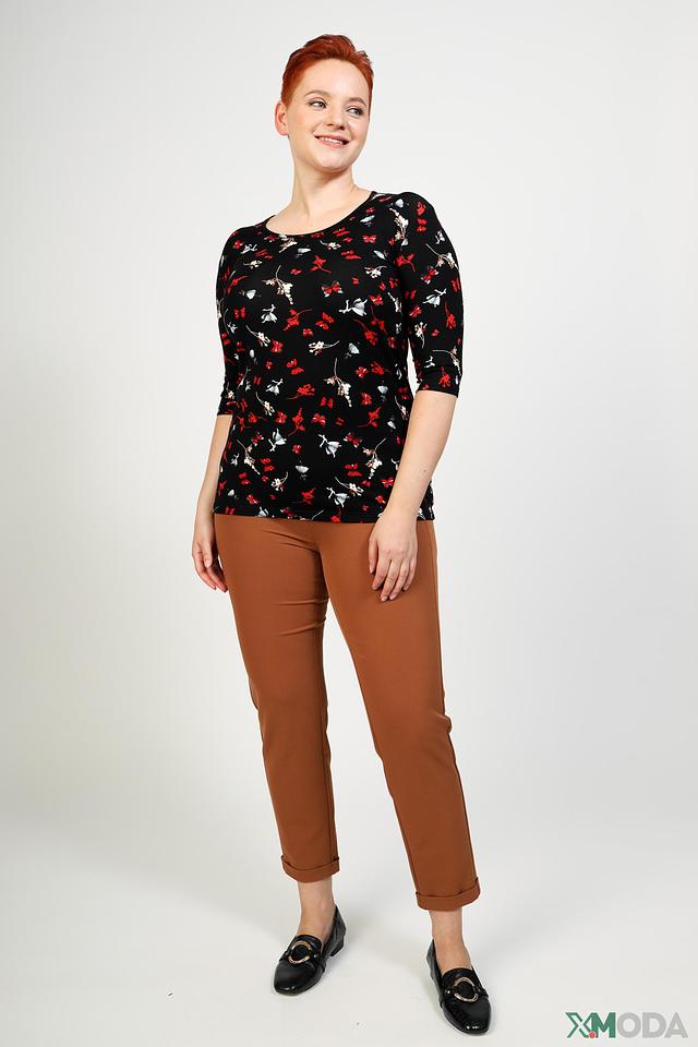 Модель имеет округлый вырез горловины и короткие рукава 3/4. Блуза выполнена из приятной к телу вискозы с добавлением спандекса, что обеспечивает комфортную посадку и небольшую эластичность.