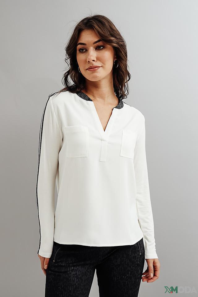 Белая блуза Pezzo с чёрной полоской на рукавах и отделкой воротника. Модель с V-образным вырезом и накладными карманами. Состав: полиэстер 100%, Состав_2 вискоза 95%, Состав_2 эластан 5%
