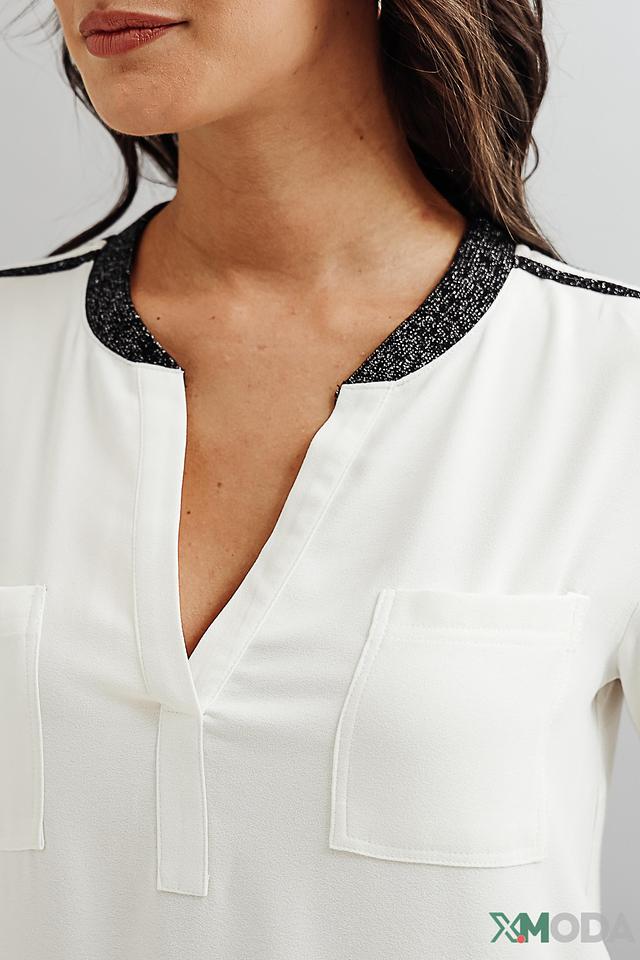 Воротник блузы также оформлен черной отделкой, что создает контрастный акцент. Изготовлена из легкой и приятной к телу ткани, обеспечивающей комфорт в течение всего дня.