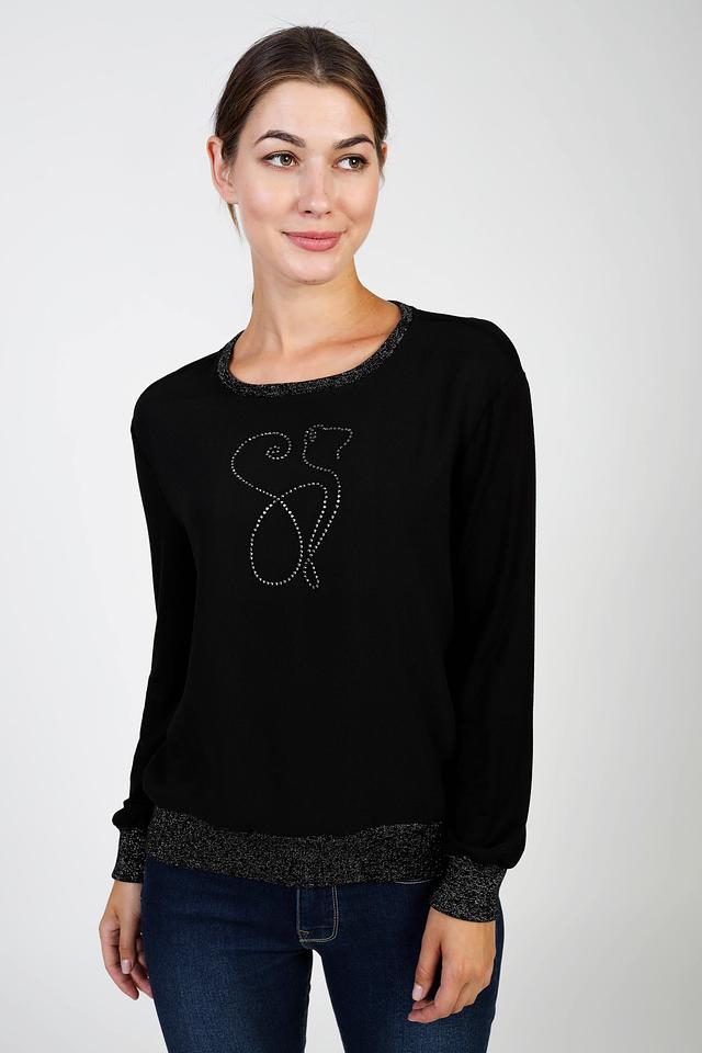 Чёрный джемпер Pezzo с изображением кошки – стильная и комфортная модель для повседневного гардероба. Изготовлен из мягкого трикотажа с декоративной отделкой горловины и манжет. Состав: полиэстер 100%, Состав_2 вискоза 95%, Состав_2 эластан 5%