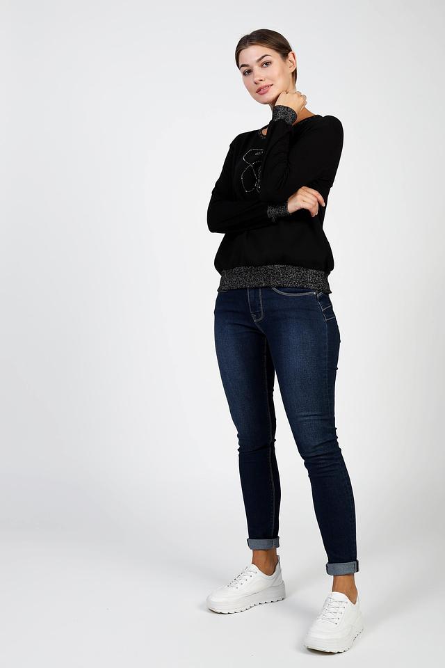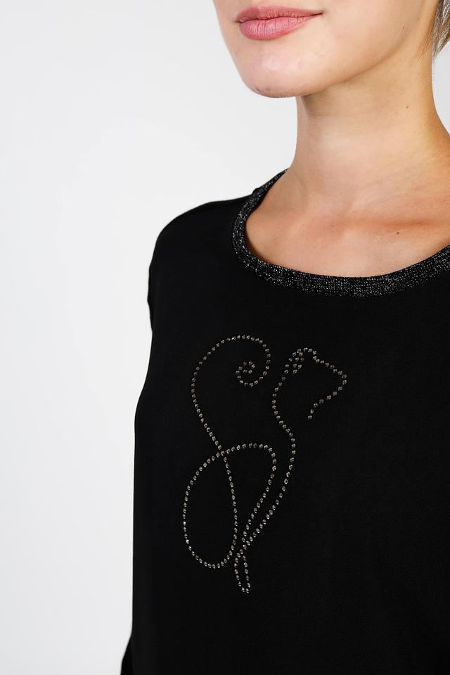 Основным элементом декора является изображение кошки, выполненное в виде страз, что придает изделию оригинальность и изысканность. Горловина и манжеты джемпера отделаны вставкой с блестящей нитью, добавляющей акцент.