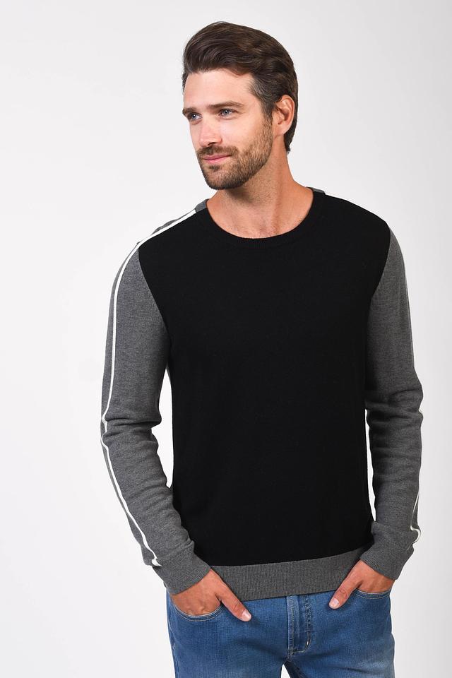 Мужской джемпер Pezzo серого и черного цвета с контрастной полосой на рукавах. Изготовлен из мягкой вискозы с добавлением шерсти и полиамида для комфорта и долговечности. Состав: вискоза 55%, шерсть 23%, полиамид 22%