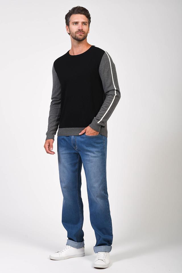 Мужской джемпер от бренда Pezzo выполнен в сочетании черного и серого цветов. Модель имеет круглый вырез горловины и длинные рукава.