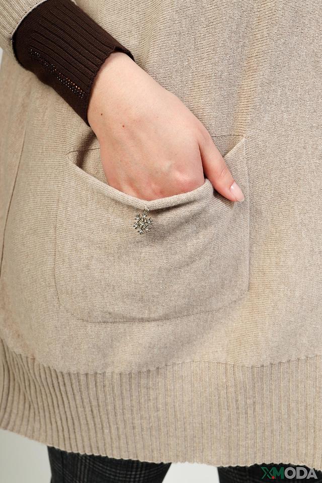 Пуловер имеет V-образный вырез, который визуально удлиняет шею и делает силуэт более изящным. Два накладных кармана добавляют практичности и оригинальности.