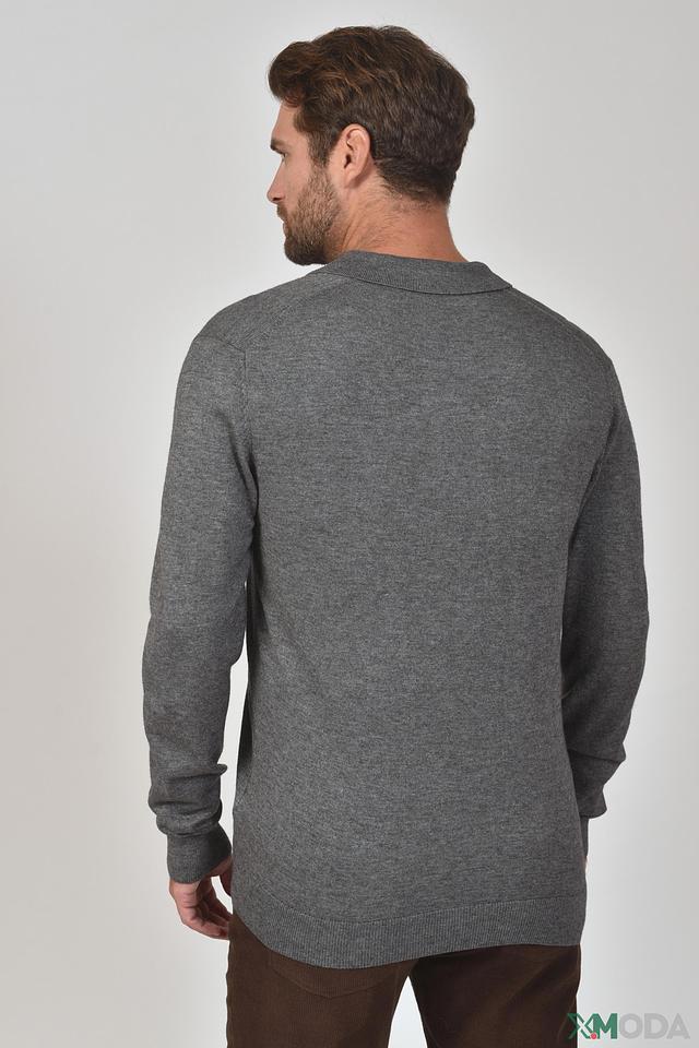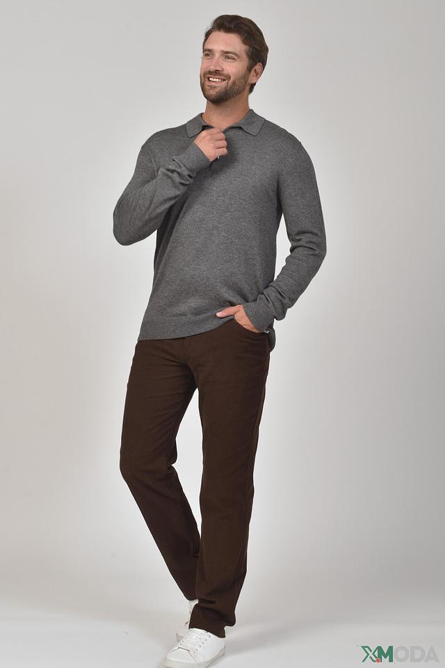 Мужской джемпер поло от бренда Pezzo выполнен в сером цвете. Модель имеет классический крой и воротник поло с V-образным вырезом, который застегивается на две пуговицы.