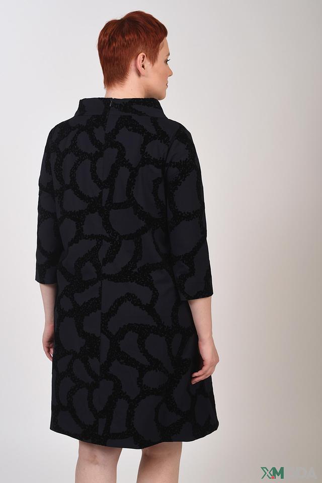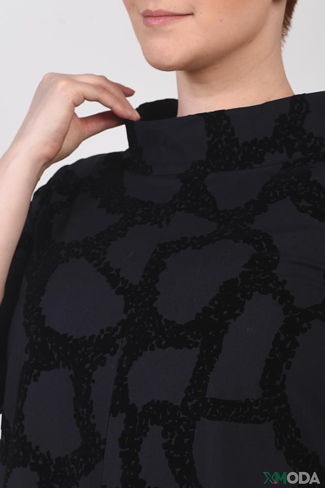Особенностью этого платья является оригинальный абстрактный принт, который делает его уникальным и привлекательным. Чёрный цвет платья универсален и легко сочетается с различными аксессуарами и обувью. Состав ткани обеспечивает легкость и воздухопроницаемость.