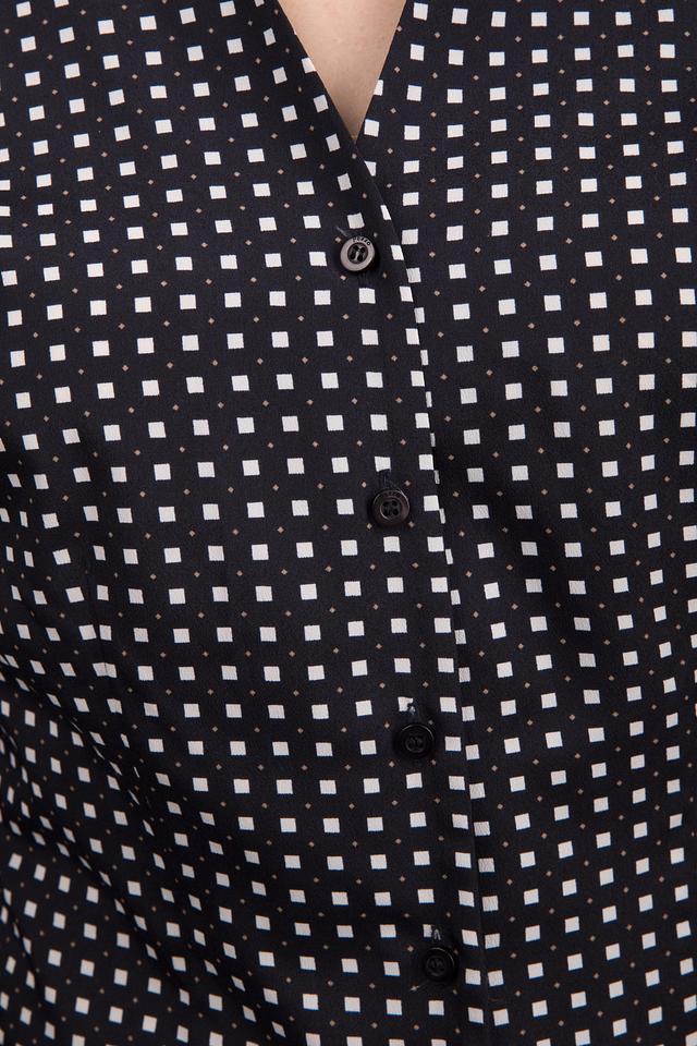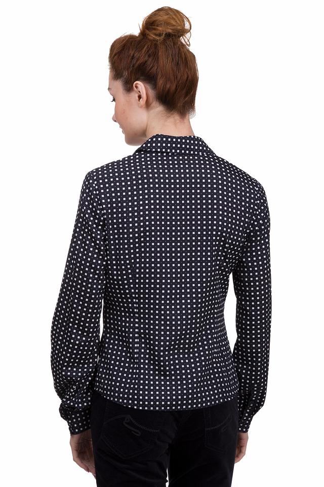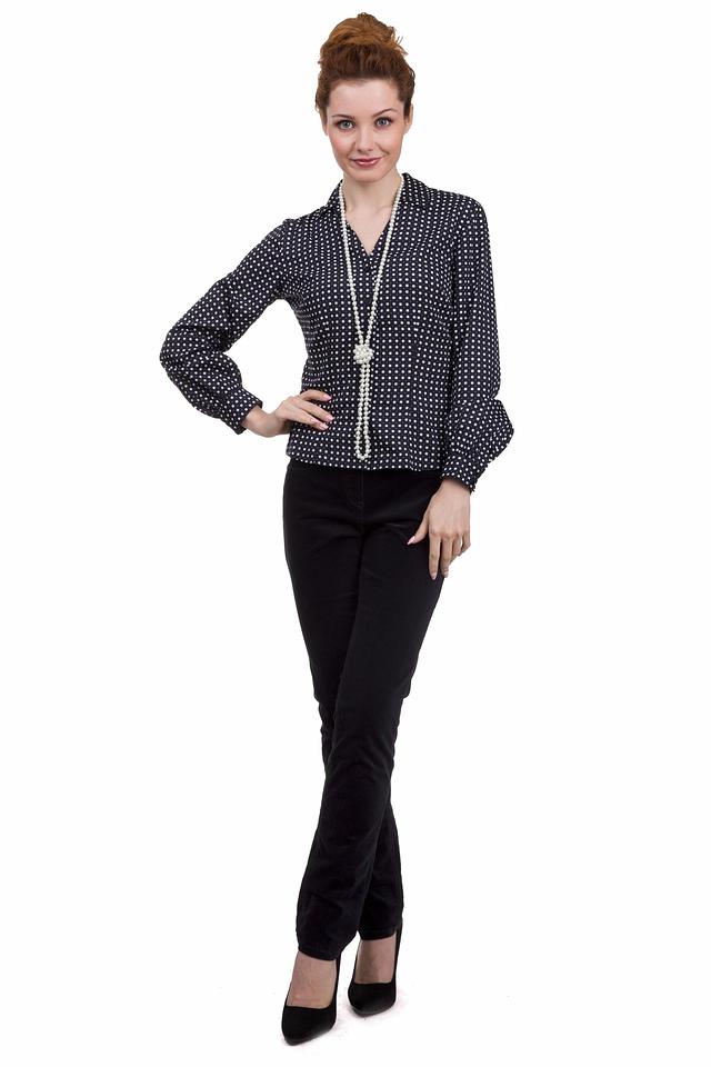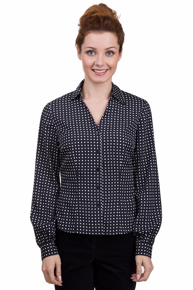 Стильная блуза Pezzo чёрного цвета с мелким белым рисунком в клетку станет отличным дополнением к вашему гардеробу. Модель с длинными рукавами и V-образным вырезом. Состав: полиэстер 100%