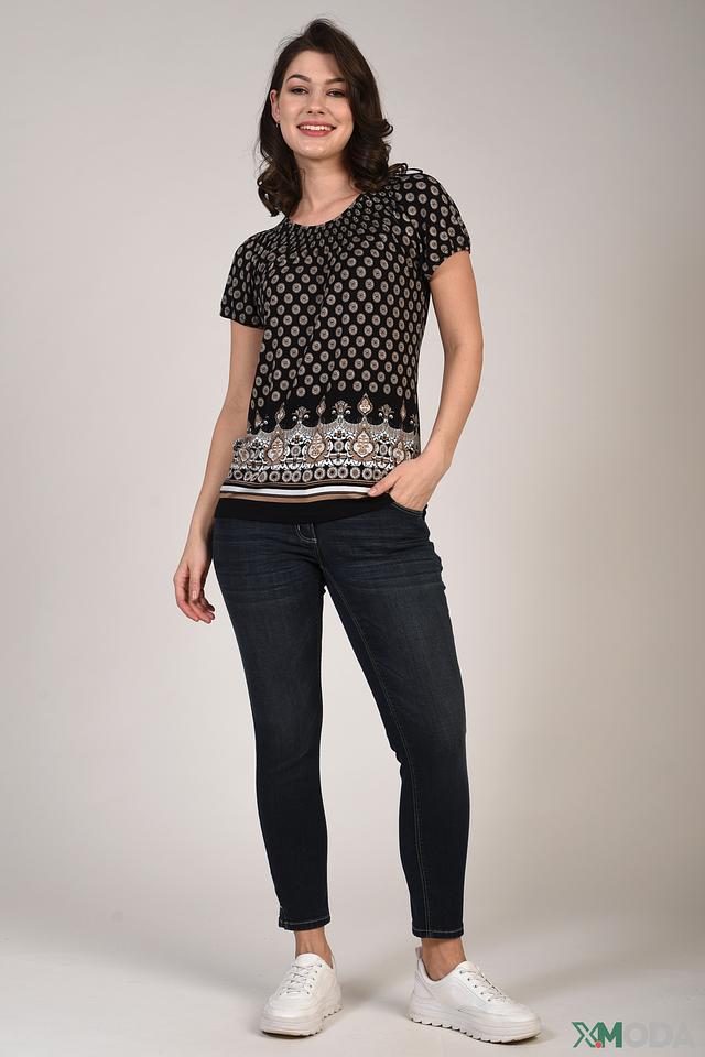 Чёрная блуза Pezzo с оригинальным принтом – стильное решение для создания повседневного образа. Модель выполнена из мягкой вискозы с добавлением эластана, что обеспечивает комфорт в носке и хорошую посадку по фигуре. Состав: вискоза 95%, эластан 5%