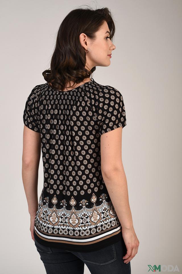 Блуза имеет свободный крой, короткие рукава и округлый вырез горловины. Эластичная вставка по горловине обеспечивает удобство при надевании и хорошую посадку. Изготовлена из качественной вискозы с небольшим добавлением эластана, что делает ее приятной к телу и обеспечивает легкую драпировку.