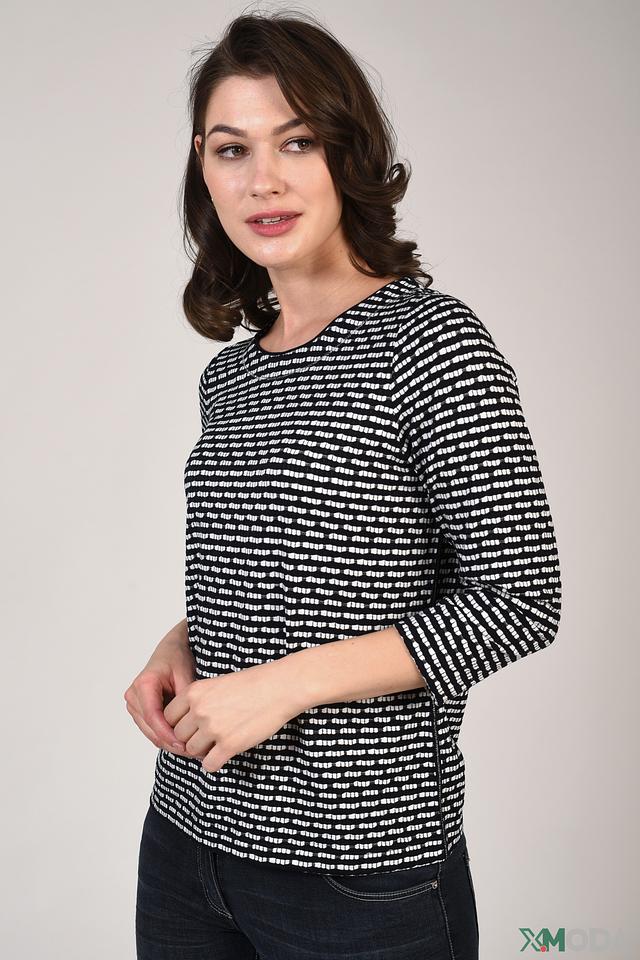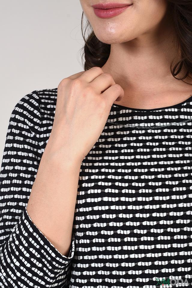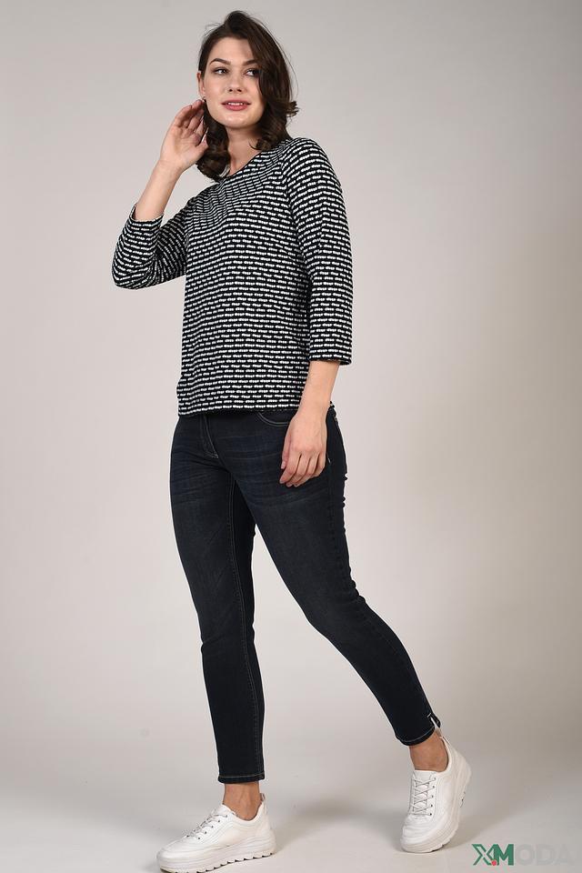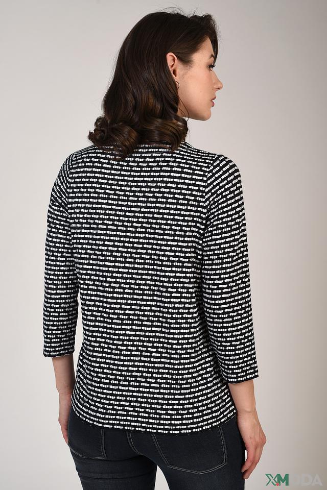 Женский пуловер Pezzo чёрно-белого цвета с полосатым принтом. Модель с 3/4 рукавом и округлым вырезом горловины станет отличным дополнением к вашему гардеробу. Состав: полиэстер 65%, хлопок 35%