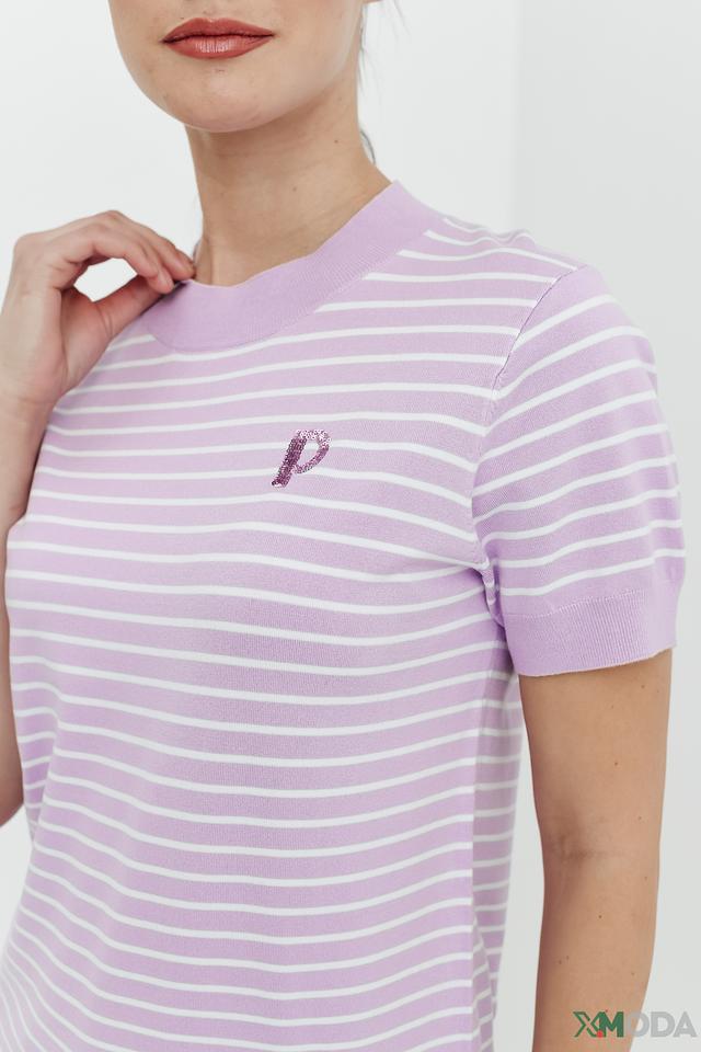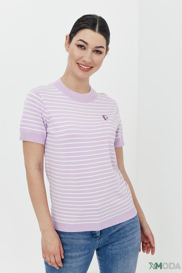 Пуловер имеет классический прямой крой и короткий рукав, что делает его идеальным для теплой погоды. Лавандовый цвет с белыми полосками придает образу свежесть и легкость. Небольшой логотип бренда на груди добавляет изысканности.
