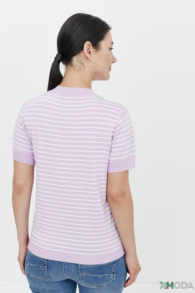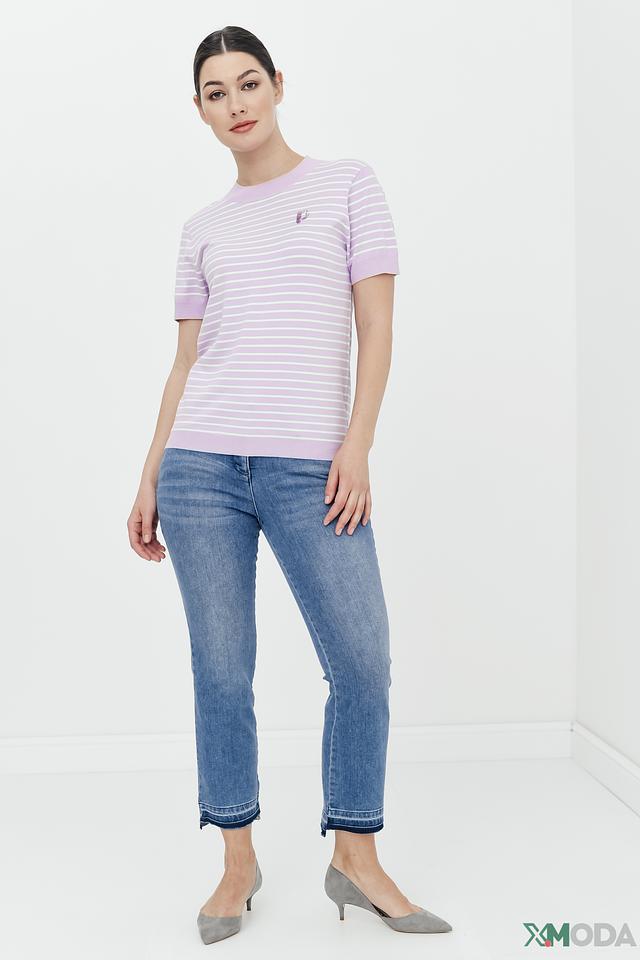 Женский пуловер Pezzo лавандового цвета с коротким рукавом и полосатым узором. Модель выполнена из мягкой вискозы с добавлением нейлона, что обеспечивает комфорт и приятные тактильные ощущения. Состав: вискоза 80%, нейлон 20%