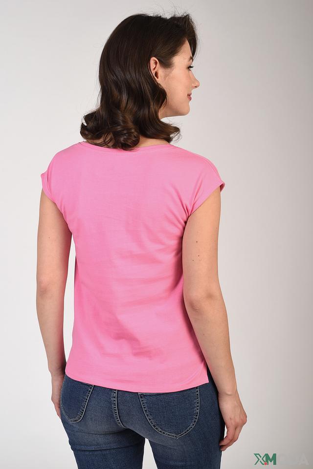 Основной цвет футболки – нежно-розовый. На передней части изделия расположена крупная аппликация в виде звезды, выполненная из блестящих золотистых и серебристых пайеток. Эта деталь придает футболке праздничный и игривый вид.