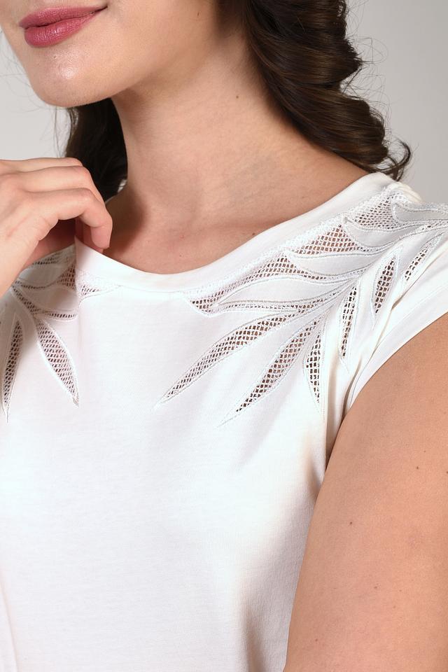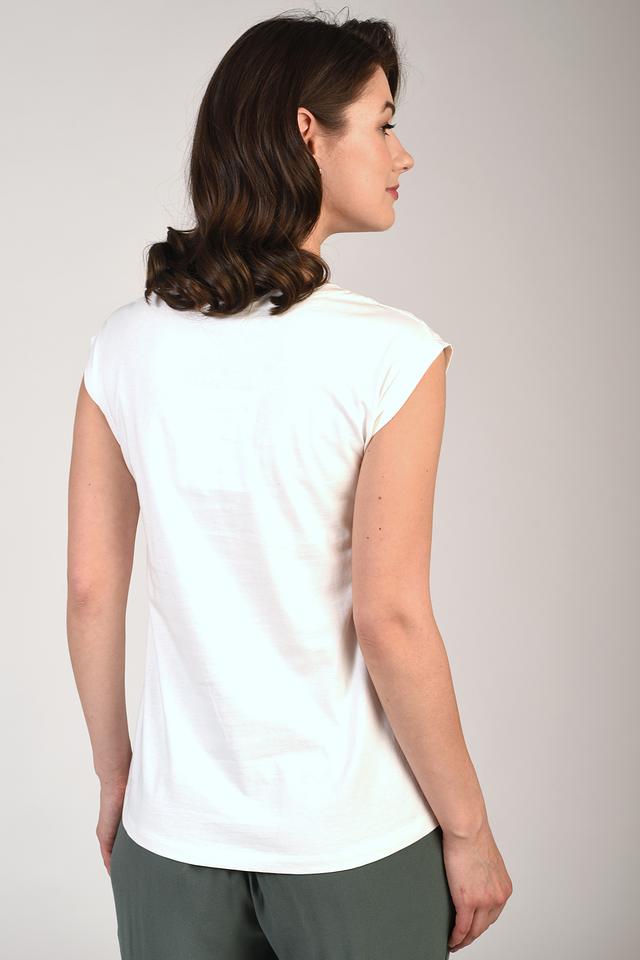 Белый цвет делает эту футболку универсальной основой для создания различных образов. Особый акцент в дизайне – вышивка в виде листьев на плечах, придающая изделию изысканность и оригинальность.