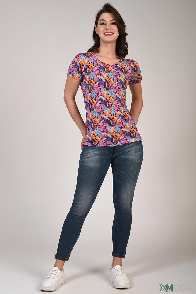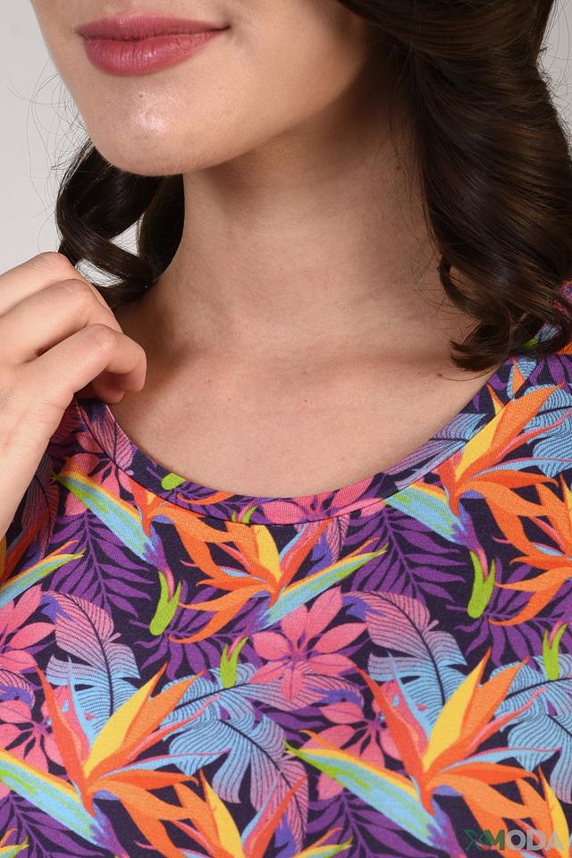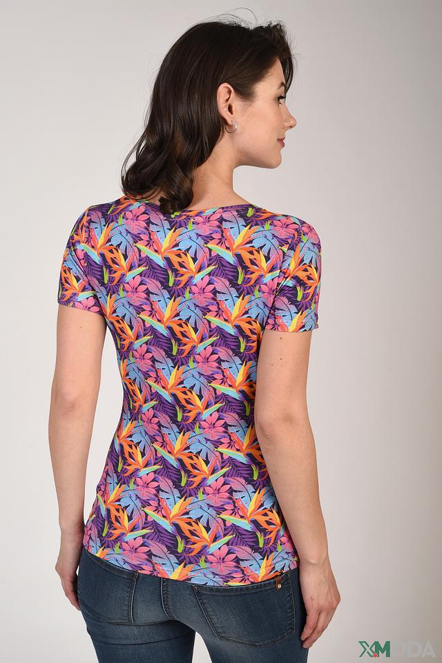 Блуза имеет короткий рукав и V-образный вырез горловины, что делает ее универсальной для различных случаев. Главная особенность модели – эффектный тропический принт, выполненный в насыщенных цветах. Он добавляет образу свежести и динамики.