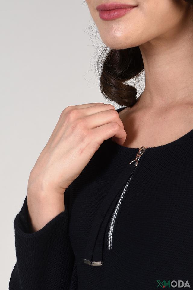 Пуловер имеет V-образный вырез, который визуально удлиняет шею и делает силуэт более изящным. Декоративная молния добавляет изделию оригинальности и позволяет регулировать глубину выреза.
