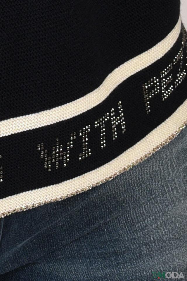 Текстурная вязка придает пуловеру объём и фактурность, а широкие рукава 3/4 обеспечивают комфорт и свободу движений. В нижней части пуловер украшен широкой белой полосой с логотипом бренда, выполненным в виде страз.